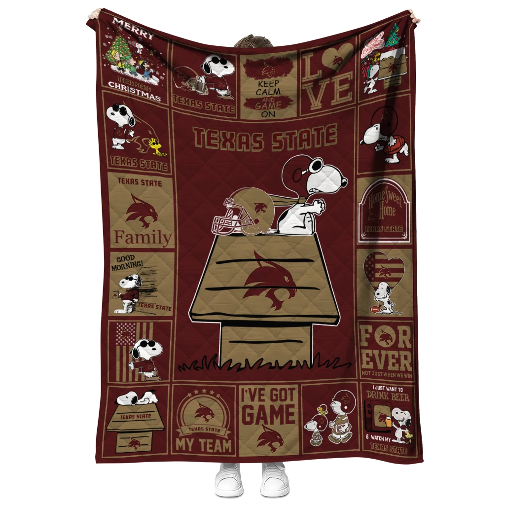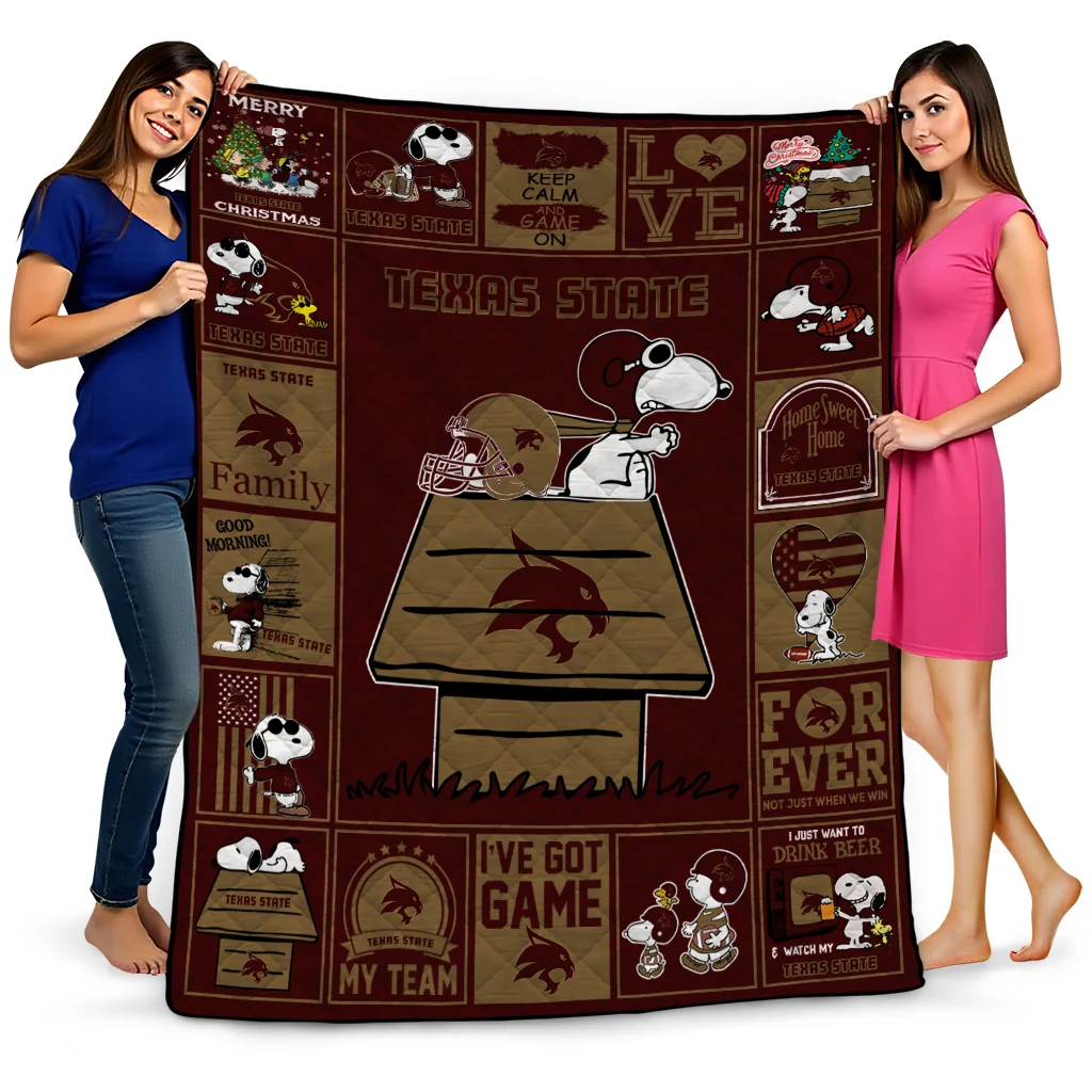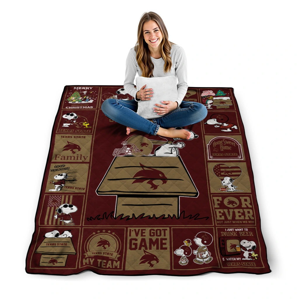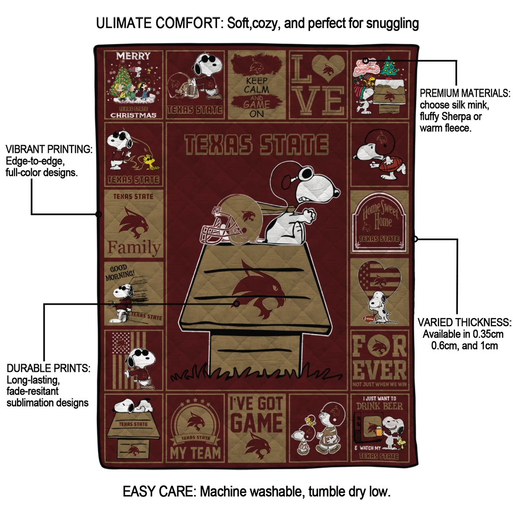 Wrap yourself in warmth and pride with the Texas State Bobcats Snoopy Love Maroon Quilt Blanket from the Texas State Bobcats Blankets collection at Yes That Blanket. Made from 100% premium quilting-weight polyester blended with a touch of microfiber, this quilt offers a smooth, soft finish you’ll love. Choose between two quilting styles—Stipple or Diagonal—and enjoy the comfort of a cotton-filled layer inside that adds extra coziness for every season. The border is available in classic black or white, giving your design a clean, timeless edge.
