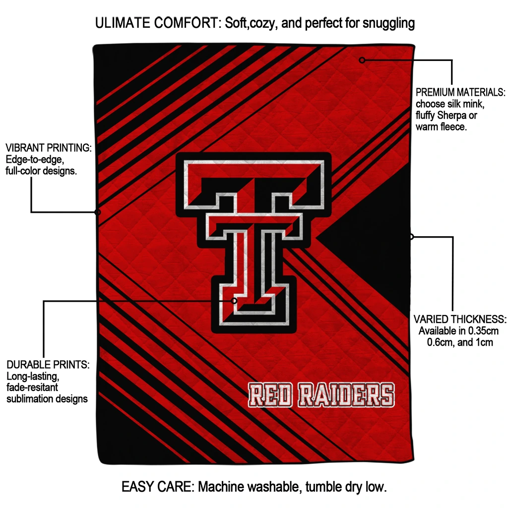 Wrap yourself in warmth and pride with the Texas Tech Red Raiders Arrow Layers Red Quilt Blanket from the Texas Tech Red Raiders Blankets collection at Yes That Blanket. Made from 100% premium quilting-weight polyester blended with a touch of microfiber, this quilt offers a smooth, soft finish you’ll love. Choose between two quilting styles—Stipple or Diagonal—and enjoy the comfort of a cotton-filled layer inside that adds extra coziness for every season. The border is available in classic black or white, giving your design a clean, timeless edge.