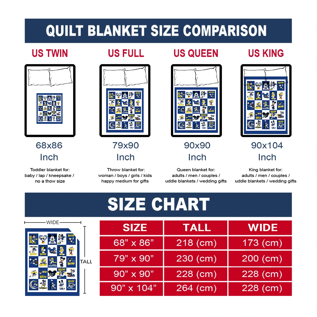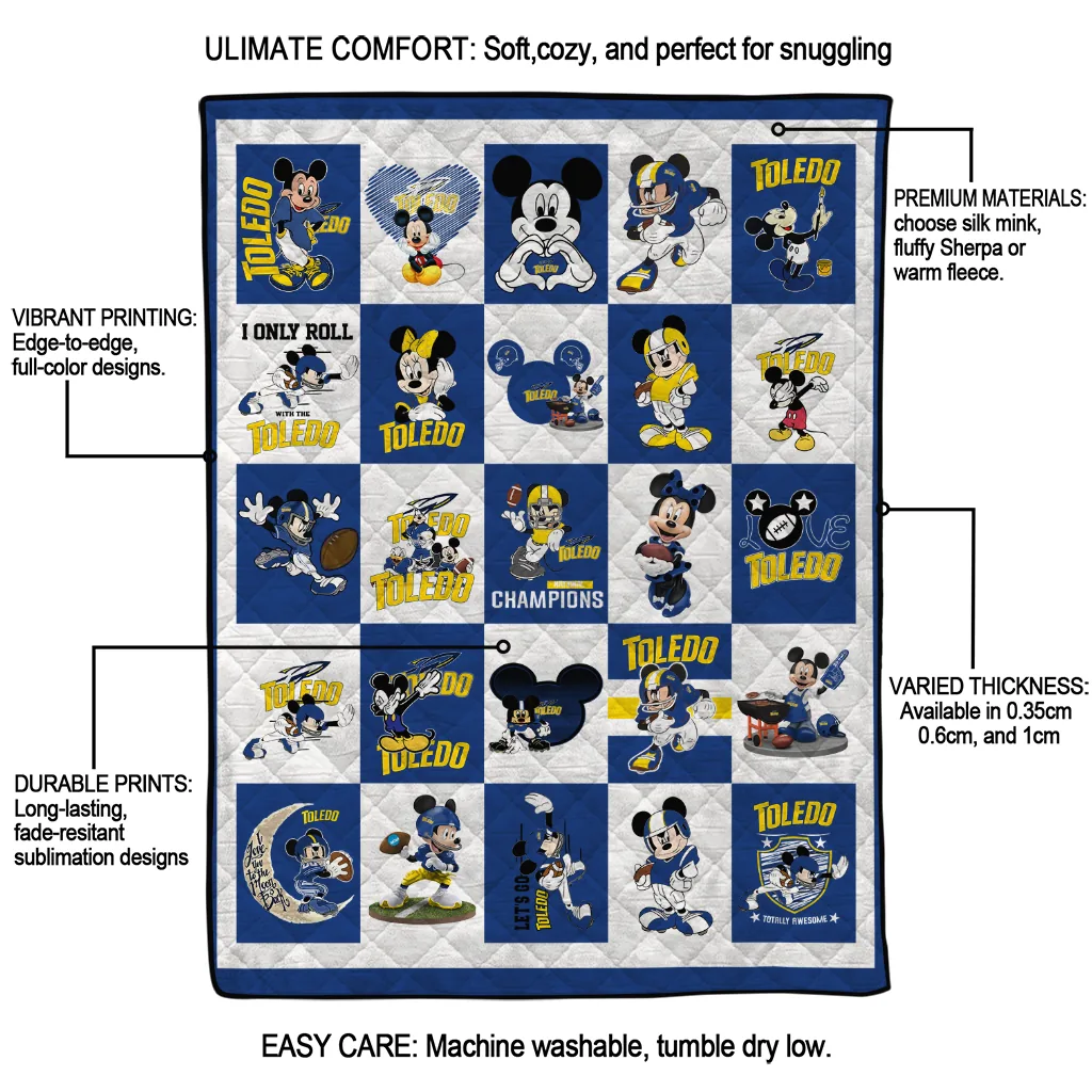 Wrap yourself in warmth and pride with the Toledo Rockets Mickey Mouse Motif Blue White Quilt Blanket from the Toledo Rockets Blankets collection at Yes That Blanket. Made from 100% premium quilting-weight polyester blended with a touch of microfiber, this quilt offers a smooth, soft finish you’ll love. Choose between two quilting styles—Stipple or Diagonal—and enjoy the comfort of a cotton-filled layer inside that adds extra coziness for every season. The border is available in classic black or white, giving your design a clean, timeless edge.