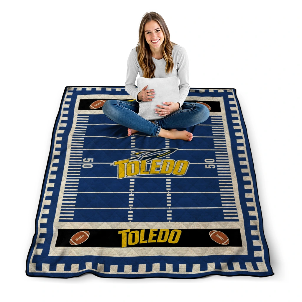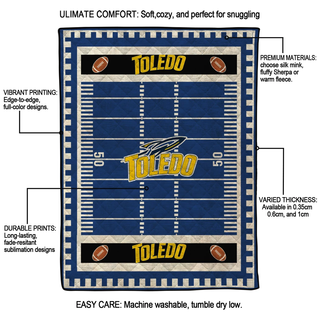 Wrap yourself in warmth and pride with the Toledo Rockets Mickey Player Blue Quilt Blanket from the Toledo Rockets Blankets collection at Yes That Blanket. Made from 100% premium quilting-weight polyester blended with a touch of microfiber, this quilt offers a smooth, soft finish you’ll love. Choose between two quilting styles—Stipple or Diagonal—and enjoy the comfort of a cotton-filled layer inside that adds extra coziness for every season. The border is available in classic black or white, giving your design a clean, timeless edge.