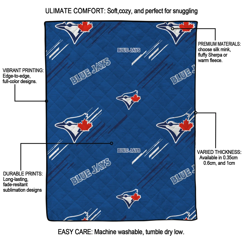 Wrap yourself in warmth and pride with the Toronto Blue Jays Sketch Lines Blue Quilt Blanket from the Toronto Blue Jays Blankets collection at Yes That Blanket. Made from 100% premium quilting-weight polyester blended with a touch of microfiber, this quilt offers a smooth, soft finish you’ll love. Choose between two quilting styles—Stipple or Diagonal—and enjoy the comfort of a cotton-filled layer inside that adds extra coziness for every season. The border is available in classic black or white, giving your design a clean, timeless edge.