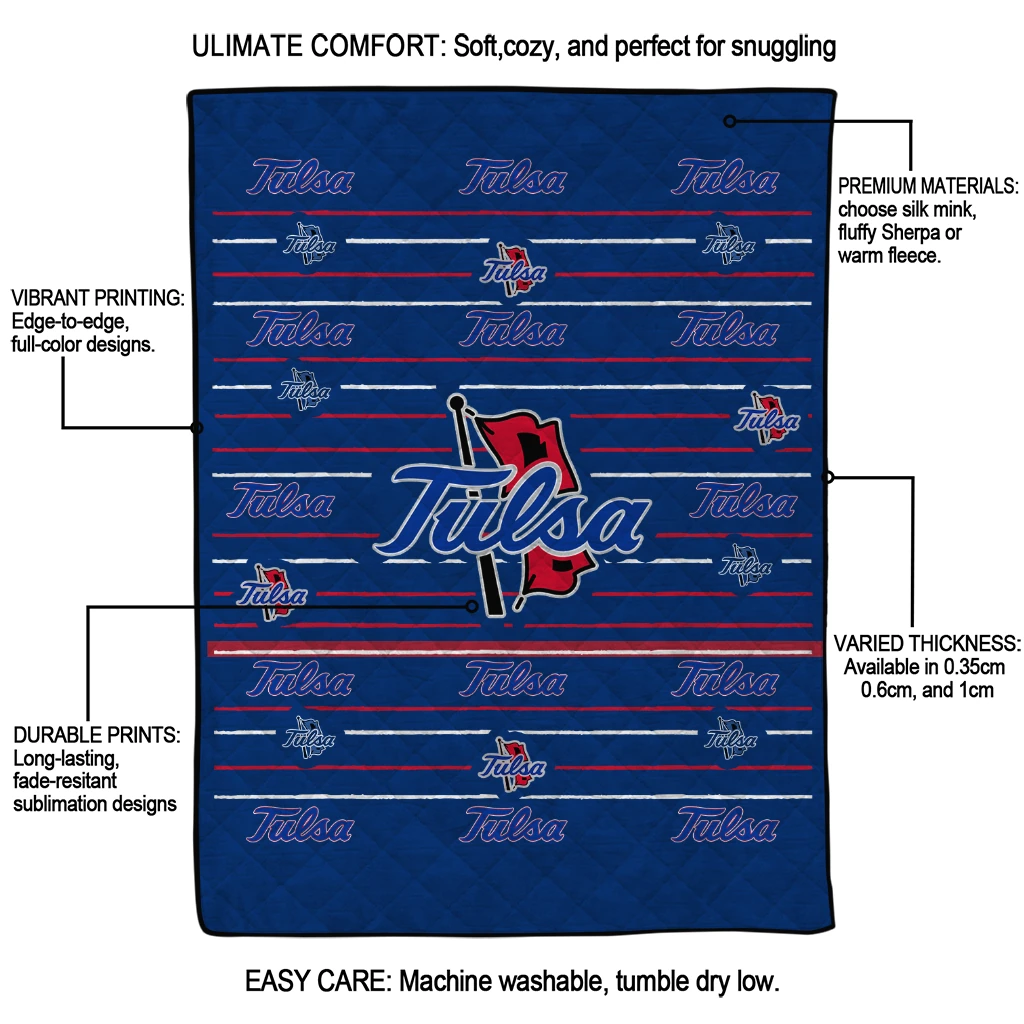 The Tulsa Golden Hurricane Handdrawn Stripes Blue Quilt Blanket is more than a blanket—it’s everyday comfort, thoughtfully made. Crafted from premium quilting fabric with a soft microfiber touch, it offers a smooth hand-feel and lasting coziness. Layered quilting with a cotton-filled core provides adaptable warmth across seasons while maintaining a clean, tailored look on your bed or sofa.