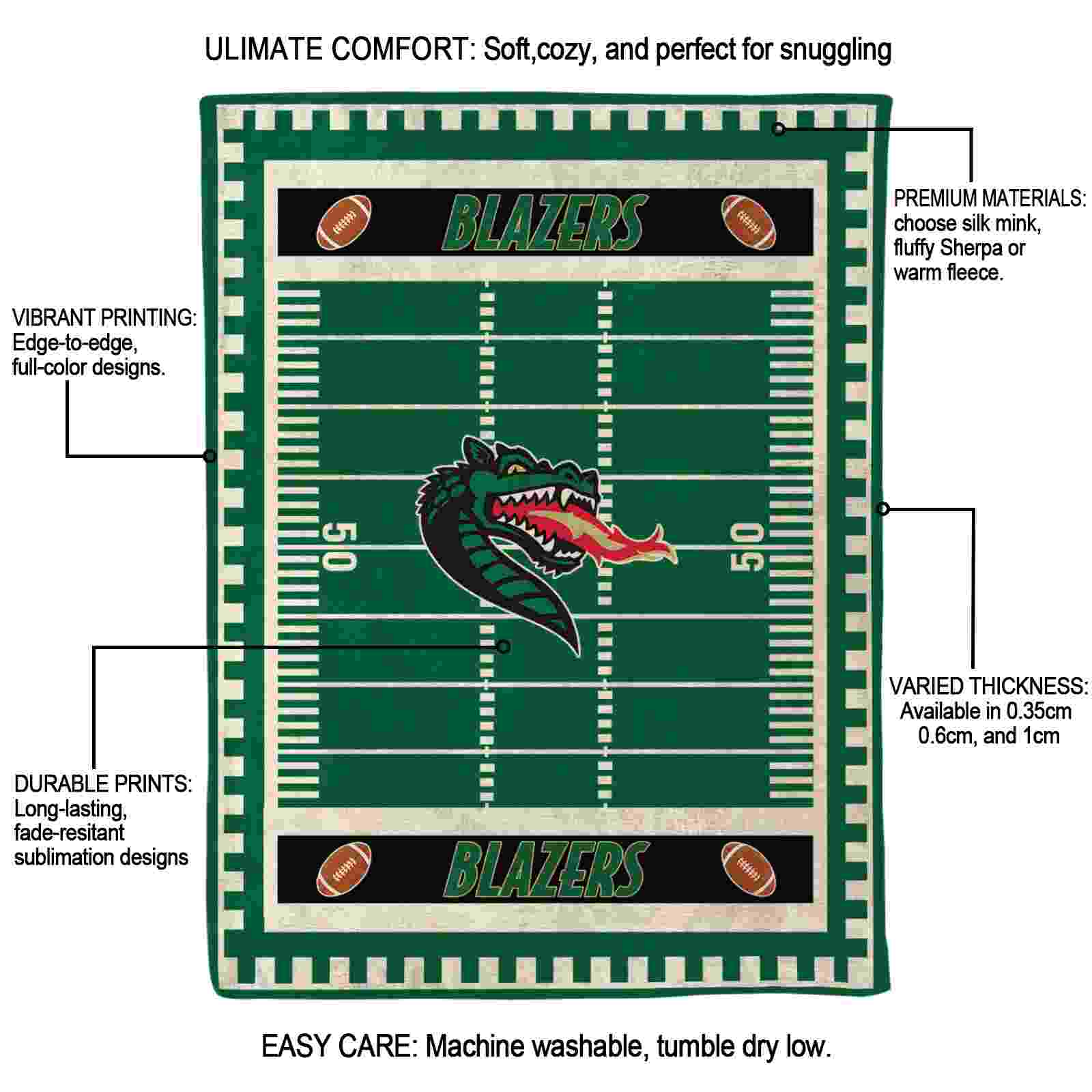 Without a doubt, the UAB Blazers Football Field Green Blanket from UAB Blazers Blankets collection is offering true fans a chance to showcase passion in a cool way. Personalize it with your favorite team's logo or a meaningful name to make it uniquely yours. Isn't that great? The full-color print ensures vibrant, edge-to-edge designs, bringing your sports enthusiasm to life!