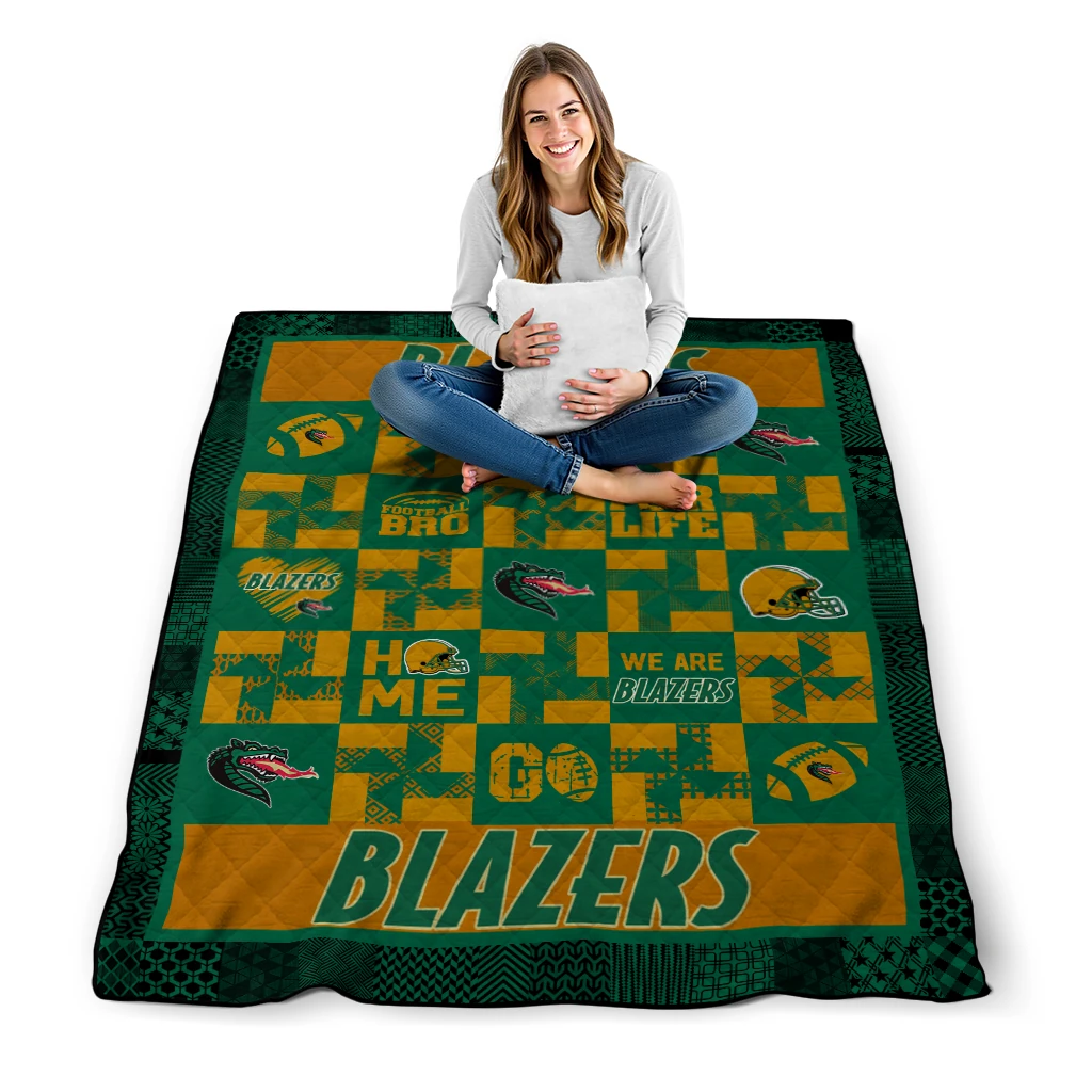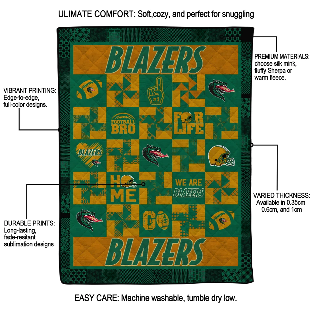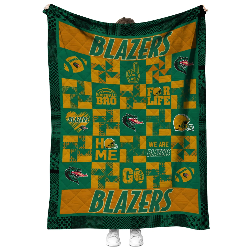 Wrap yourself in warmth and pride with the UAB Blazers Helmet Heart Green Quilt Blanket from the UAB Blazers Blankets collection at Yes That Blanket. Made from 100% premium quilting-weight polyester blended with a touch of microfiber, this quilt offers a smooth, soft finish you’ll love. Choose between two quilting styles—Stipple or Diagonal—and enjoy the comfort of a cotton-filled layer inside that adds extra coziness for every season. The border is available in classic black or white, giving your design a clean, timeless edge.
