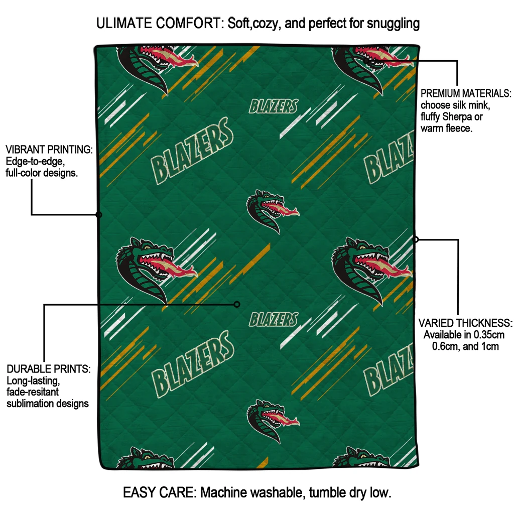 The UAB Blazers Sketch Lines Green Quilt Blanket is more than a blanket—it’s everyday comfort, thoughtfully made. Crafted from premium quilting fabric with a soft microfiber touch, it offers a smooth hand-feel and lasting coziness. Layered quilting with a cotton-filled core provides adaptable warmth across seasons while maintaining a clean, tailored look on your bed or sofa.