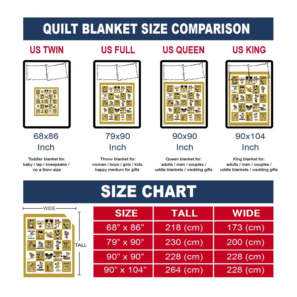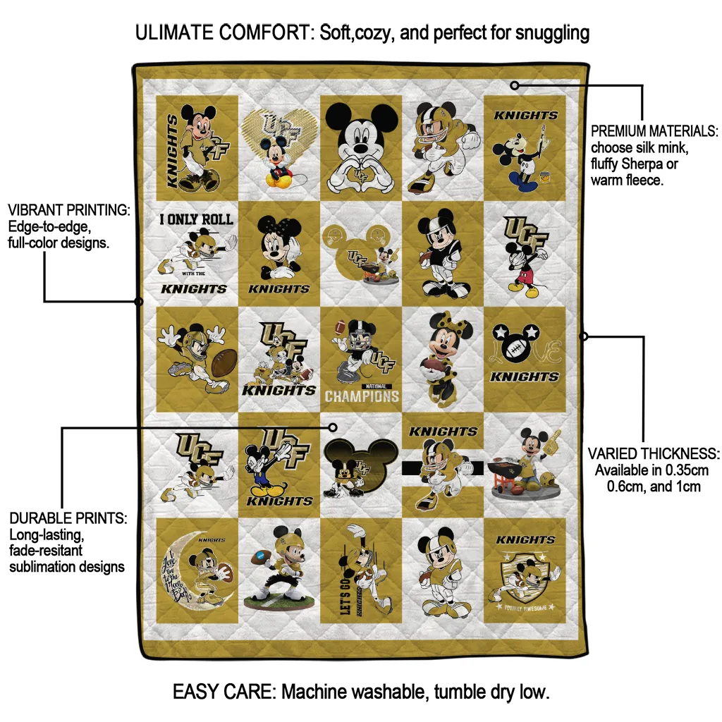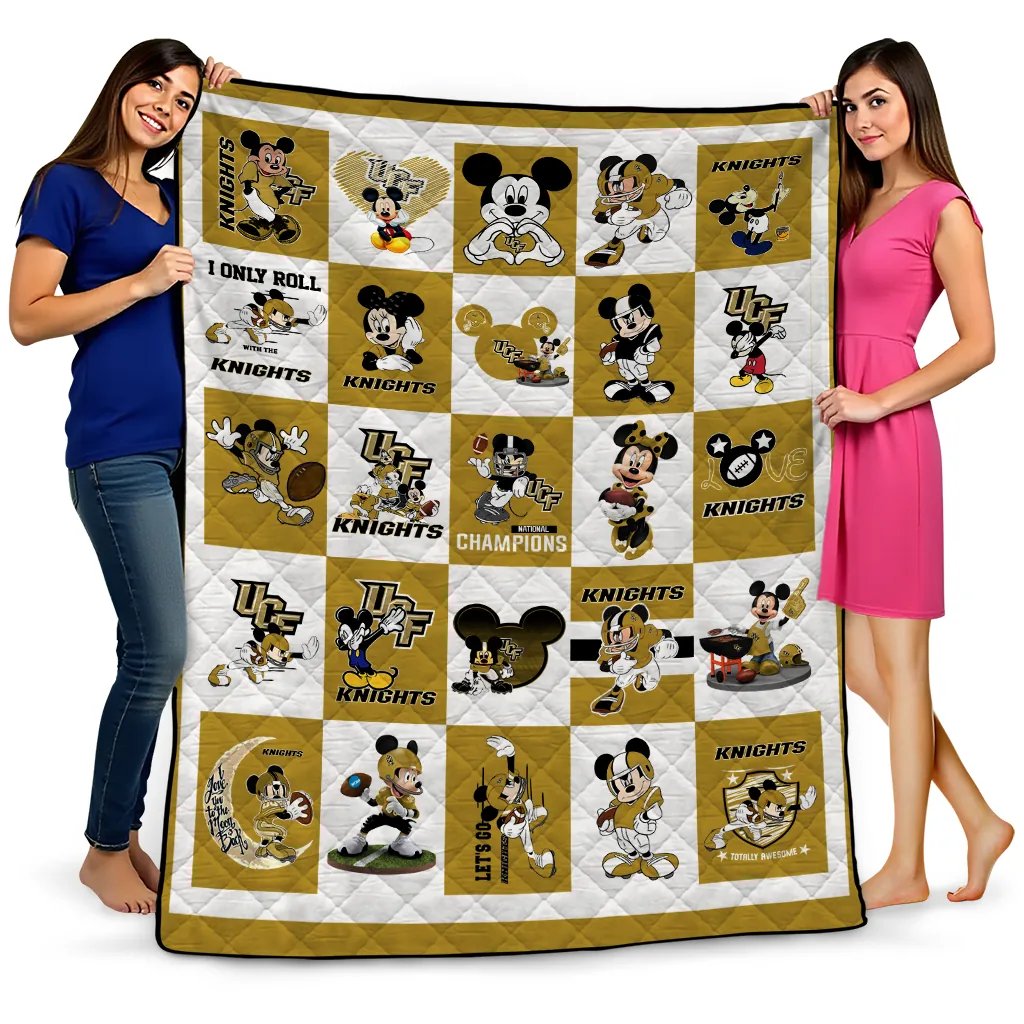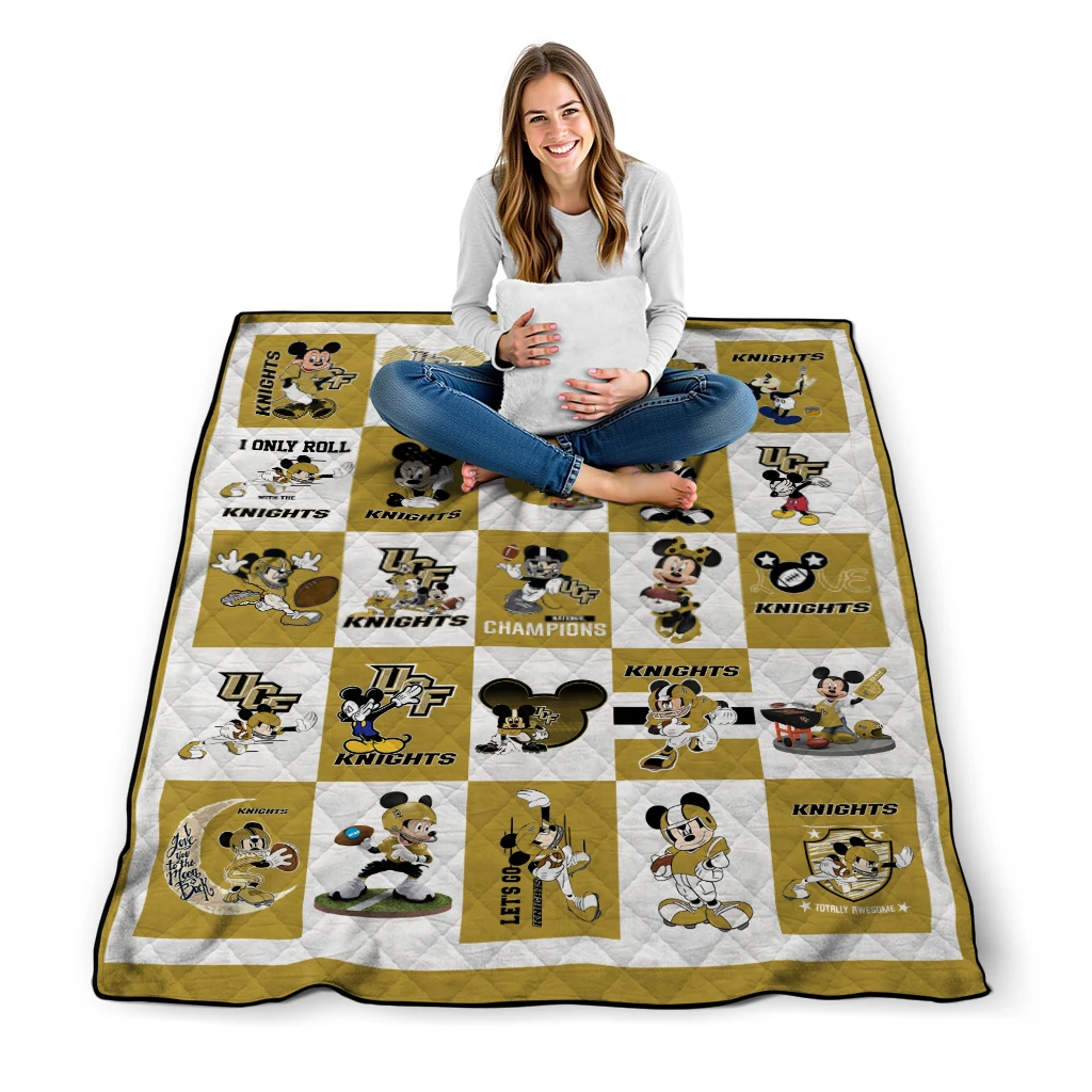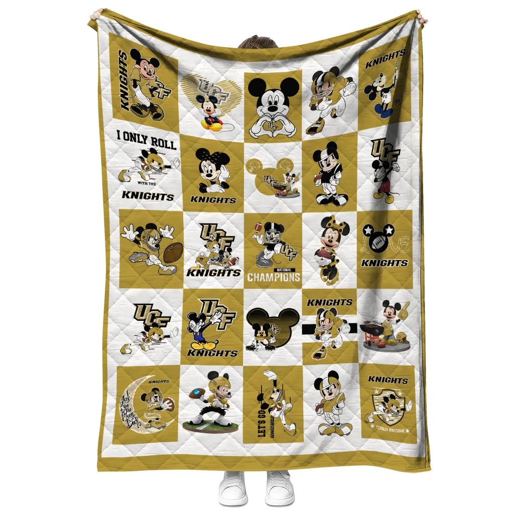 Wrap yourself in warmth and pride with the UCF Knights Mickey Mouse Motif Gold White Quilt Blanket from the UCF Knights Blankets collection at Yes That Blanket. Made from 100% premium quilting-weight polyester blended with a touch of microfiber, this quilt offers a smooth, soft finish you’ll love. Choose between two quilting styles—Stipple or Diagonal—and enjoy the comfort of a cotton-filled layer inside that adds extra coziness for every season. The border is available in classic black or white, giving your design a clean, timeless edge.