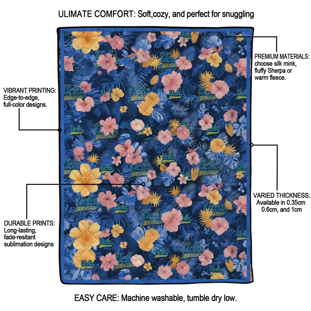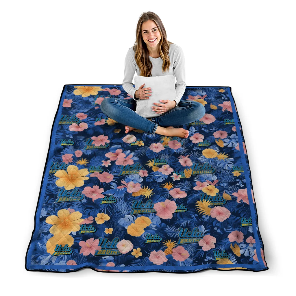 Wrap yourself in warmth and pride with the UCLA Bruins Hibiscus Foliage Blue Quilt Blanket from the UCLA Bruins Blankets collection at Yes That Blanket. Made from 100% premium quilting-weight polyester blended with a touch of microfiber, this quilt offers a smooth, soft finish you’ll love. Choose between two quilting styles—Stipple or Diagonal—and enjoy the comfort of a cotton-filled layer inside that adds extra coziness for every season. The border is available in classic black or white, giving your design a clean, timeless edge.