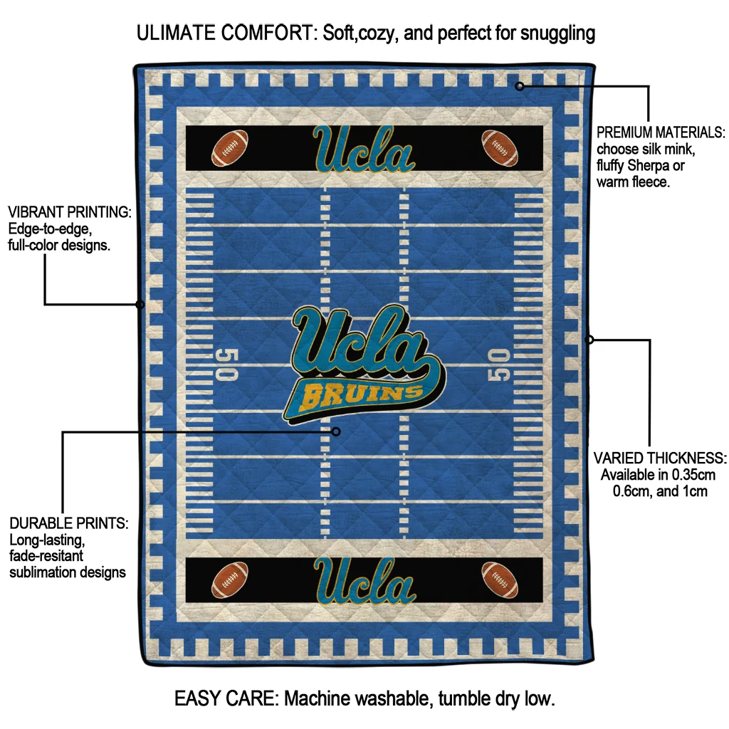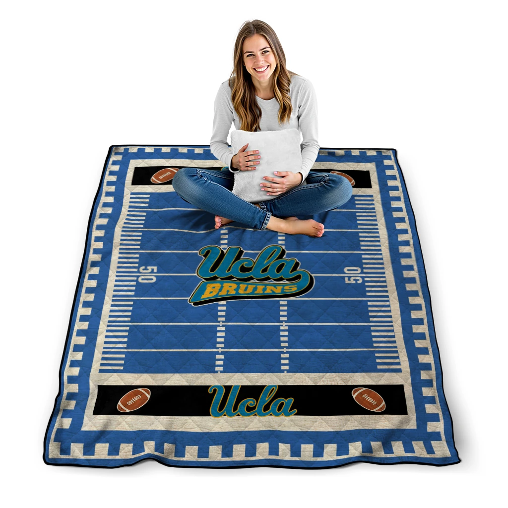 Wrap yourself in warmth and pride with the UCLA Bruins Mickey Player Blue Quilt Blanket from the UCLA Bruins Blankets collection at Yes That Blanket. Made from 100% premium quilting-weight polyester blended with a touch of microfiber, this quilt offers a smooth, soft finish you’ll love. Choose between two quilting styles—Stipple or Diagonal—and enjoy the comfort of a cotton-filled layer inside that adds extra coziness for every season. The border is available in classic black or white, giving your design a clean, timeless edge.