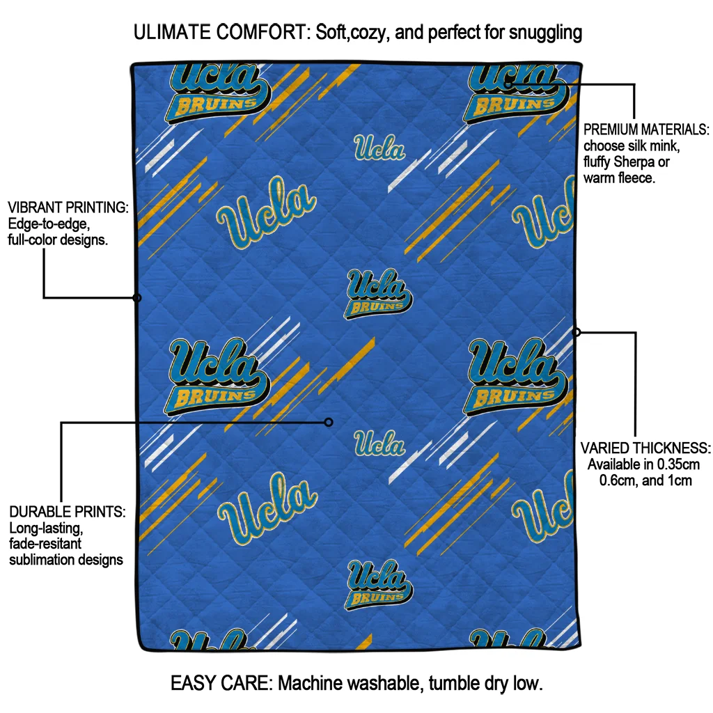 Wrap yourself in warmth and pride with the UCLA Bruins Sketch Lines Blue Quilt Blanket from the UCLA Bruins Blankets collection at Yes That Blanket. Made from 100% premium quilting-weight polyester blended with a touch of microfiber, this quilt offers a smooth, soft finish you’ll love. Choose between two quilting styles—Stipple or Diagonal—and enjoy the comfort of a cotton-filled layer inside that adds extra coziness for every season. The border is available in classic black or white, giving your design a clean, timeless edge.