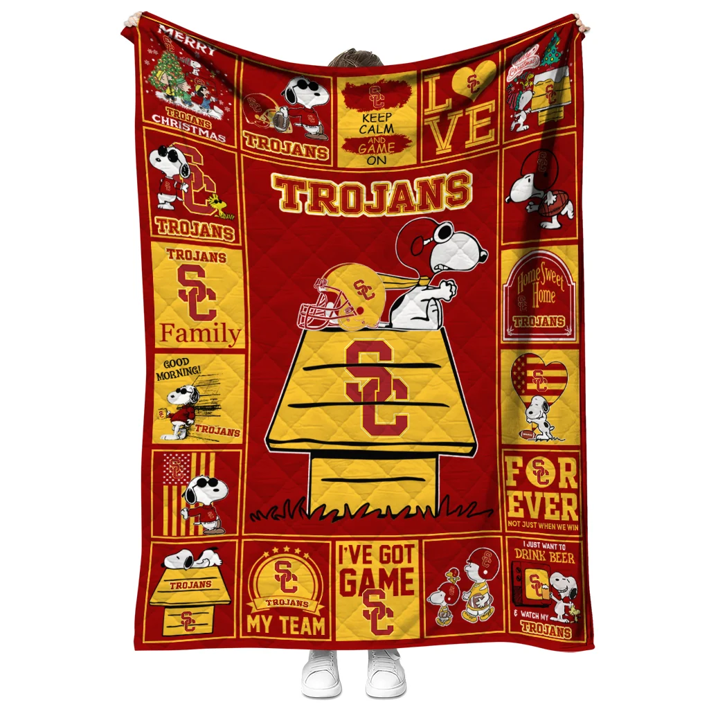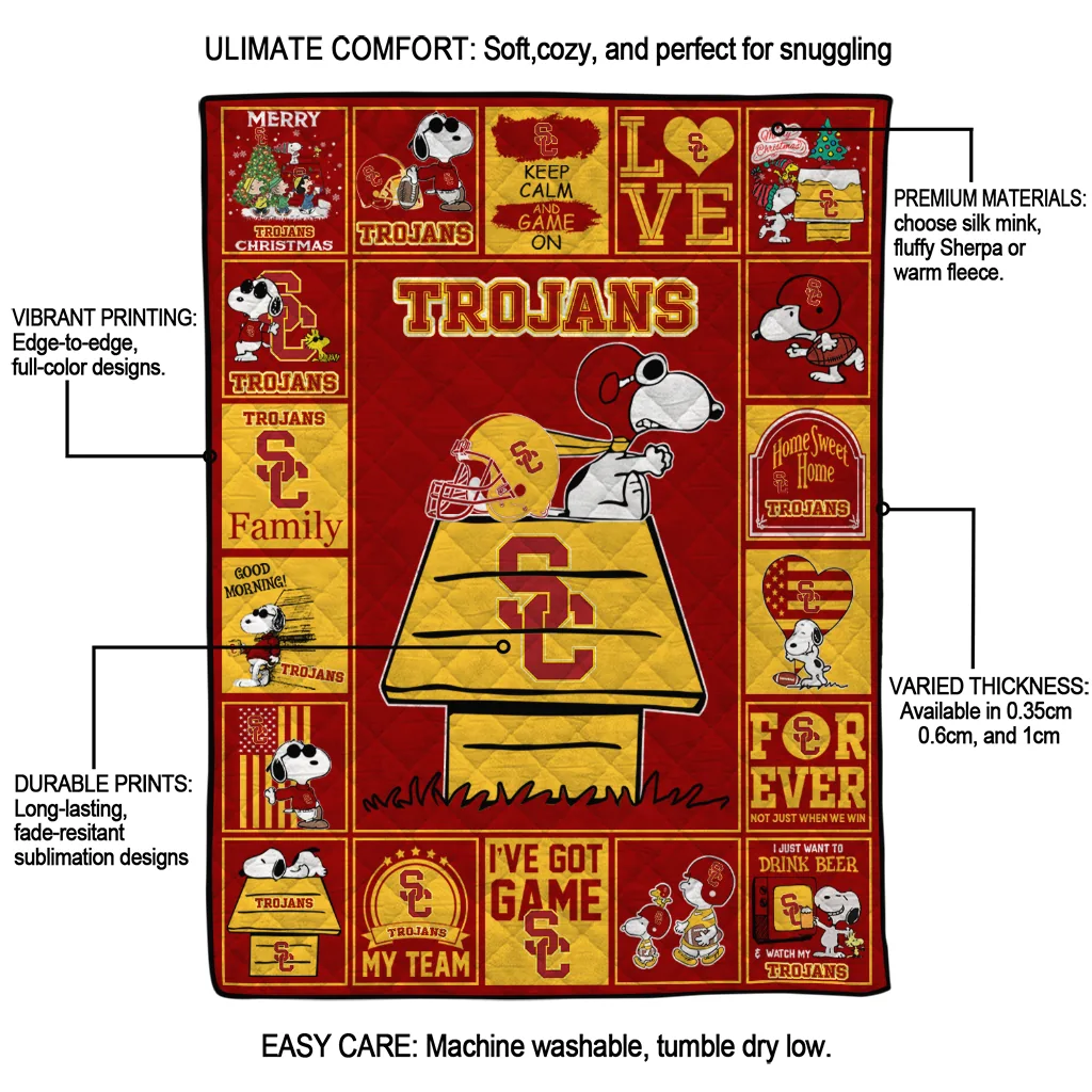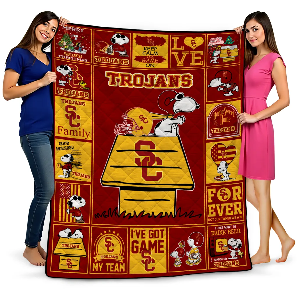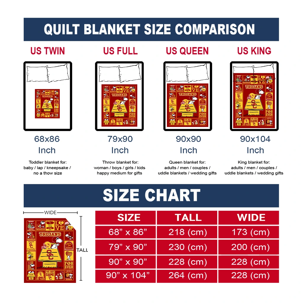 Wrap yourself in warmth and pride with the USC Trojans Snoopy Love Red Quilt Blanket from the USC Trojans Blankets collection at Yes That Blanket. Made from 100% premium quilting-weight polyester blended with a touch of microfiber, this quilt offers a smooth, soft finish you’ll love. Choose between two quilting styles—Stipple or Diagonal—and enjoy the comfort of a cotton-filled layer inside that adds extra coziness for every season. The border is available in classic black or white, giving your design a clean, timeless edge.