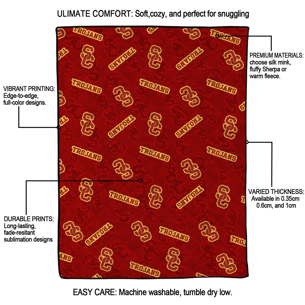 Wrap yourself in warmth and pride with the USC Trojans Solid Classic Red Quilt Blanket from the USC Trojans Blankets collection at Yes That Blanket. Made from 100% premium quilting-weight polyester blended with a touch of microfiber, this quilt offers a smooth, soft finish you’ll love. Choose between two quilting styles—Stipple or Diagonal—and enjoy the comfort of a cotton-filled layer inside that adds extra coziness for every season. The border is available in classic black or white, giving your design a clean, timeless edge.