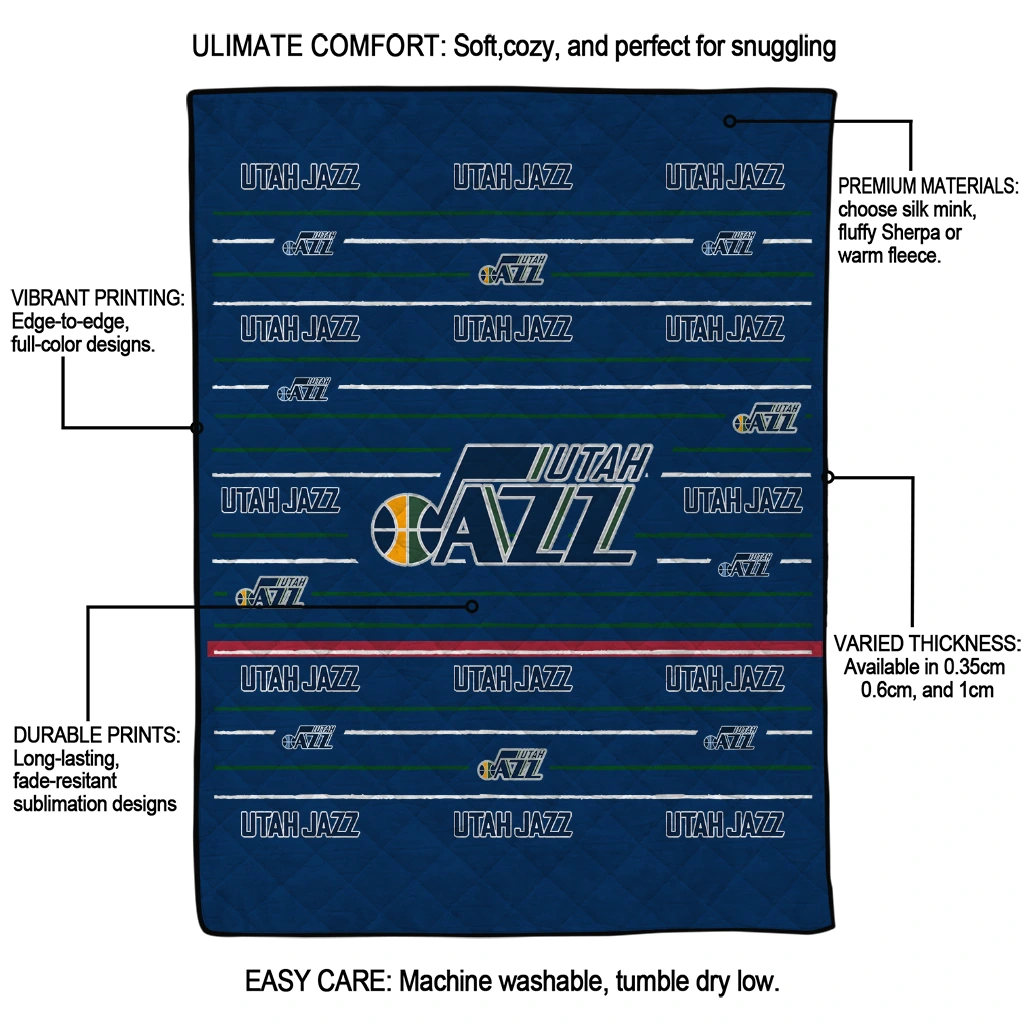 Wrap yourself in warmth and pride with the Utah Jazz Handdrawn Stripes Navy Quilt Blanket from the Utah Jazz Blankets collection at Yes That Blanket. Made from 100% premium quilting-weight polyester blended with a touch of microfiber, this quilt offers a smooth, soft finish you’ll love. Choose between two quilting styles—Stipple or Diagonal—and enjoy the comfort of a cotton-filled layer inside that adds extra coziness for every season. The border is available in classic black or white, giving your design a clean, timeless edge.