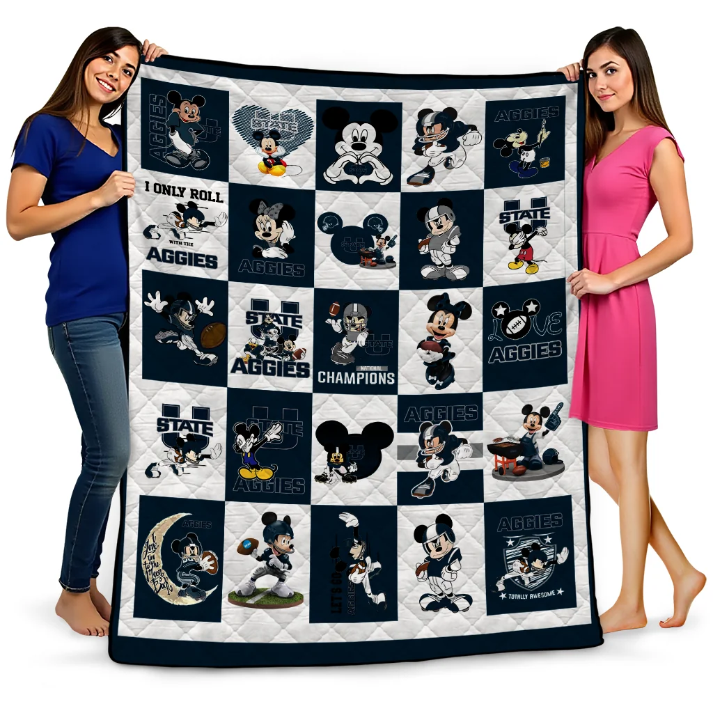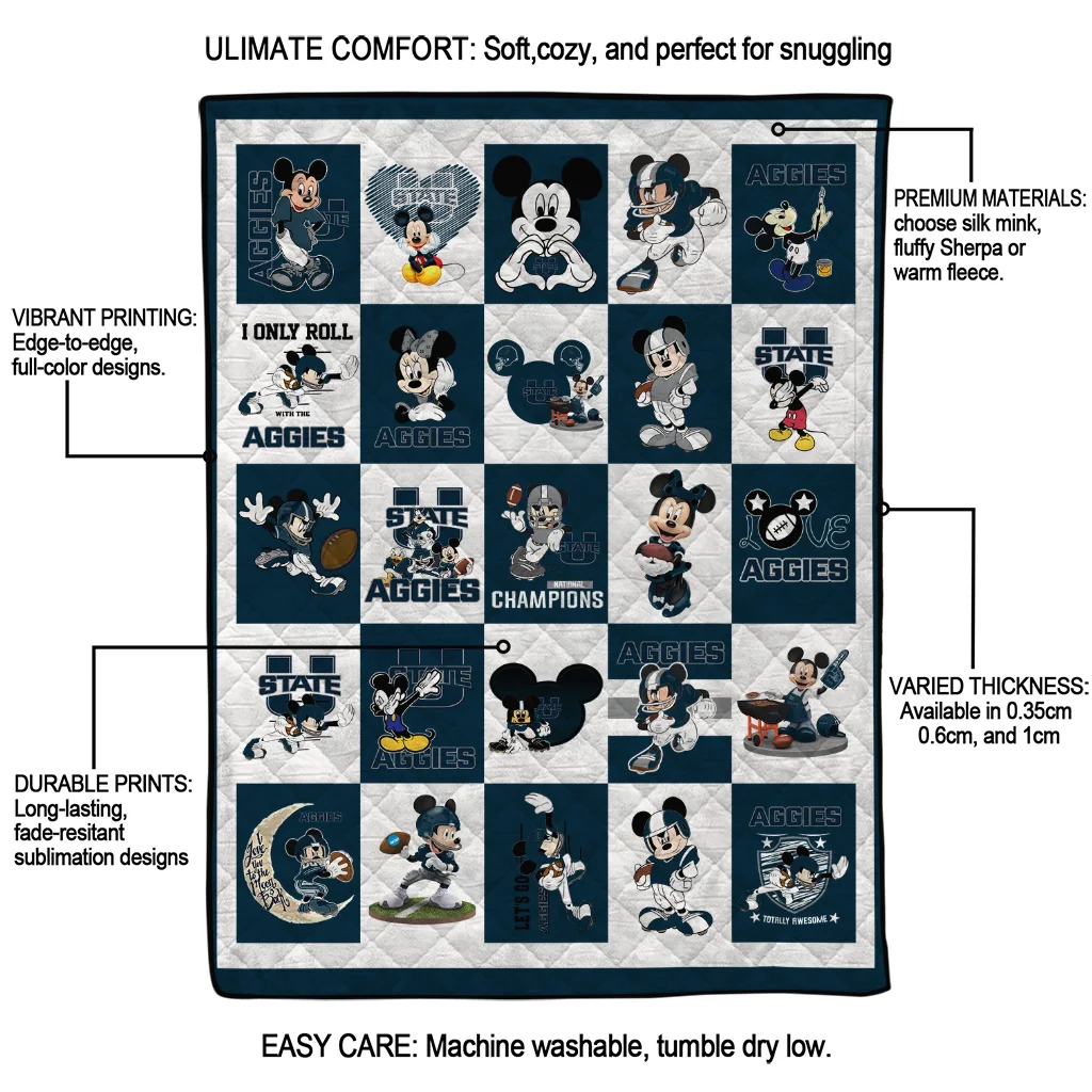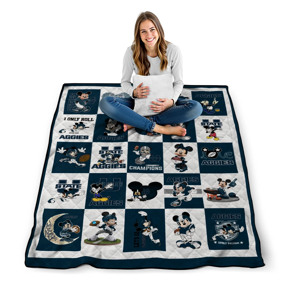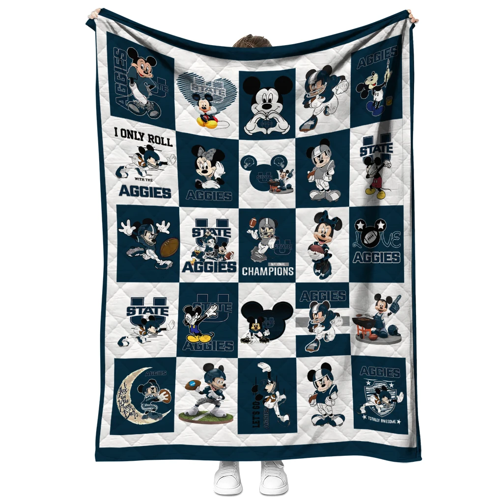 Wrap yourself in warmth and pride with the Utah State Aggies Mickey Mouse Motif Navy White Quilt Blanket from the Utah State Aggies Blankets collection at Yes That Blanket. Made from 100% premium quilting-weight polyester blended with a touch of microfiber, this quilt offers a smooth, soft finish you’ll love. Choose between two quilting styles—Stipple or Diagonal—and enjoy the comfort of a cotton-filled layer inside that adds extra coziness for every season. The border is available in classic black or white, giving your design a clean, timeless edge.