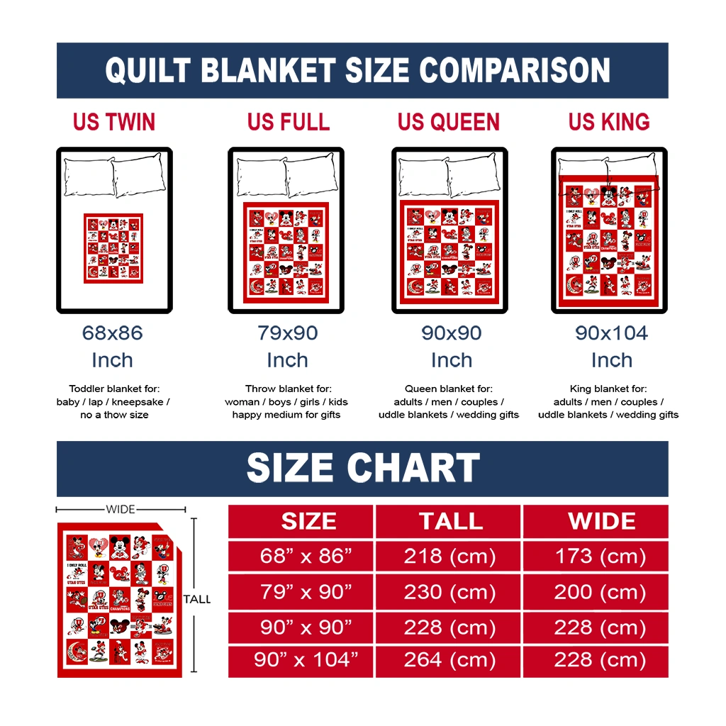 Wrap yourself in warmth and pride with the Utah Utes Mickey Mouse Motif Red White Quilt Blanket from the Utah Utes Blankets collection at Yes That Blanket. Made from 100% premium quilting-weight polyester blended with a touch of microfiber, this quilt offers a smooth, soft finish you’ll love. Choose between two quilting styles—Stipple or Diagonal—and enjoy the comfort of a cotton-filled layer inside that adds extra coziness for every season. The border is available in classic black or white, giving your design a clean, timeless edge.