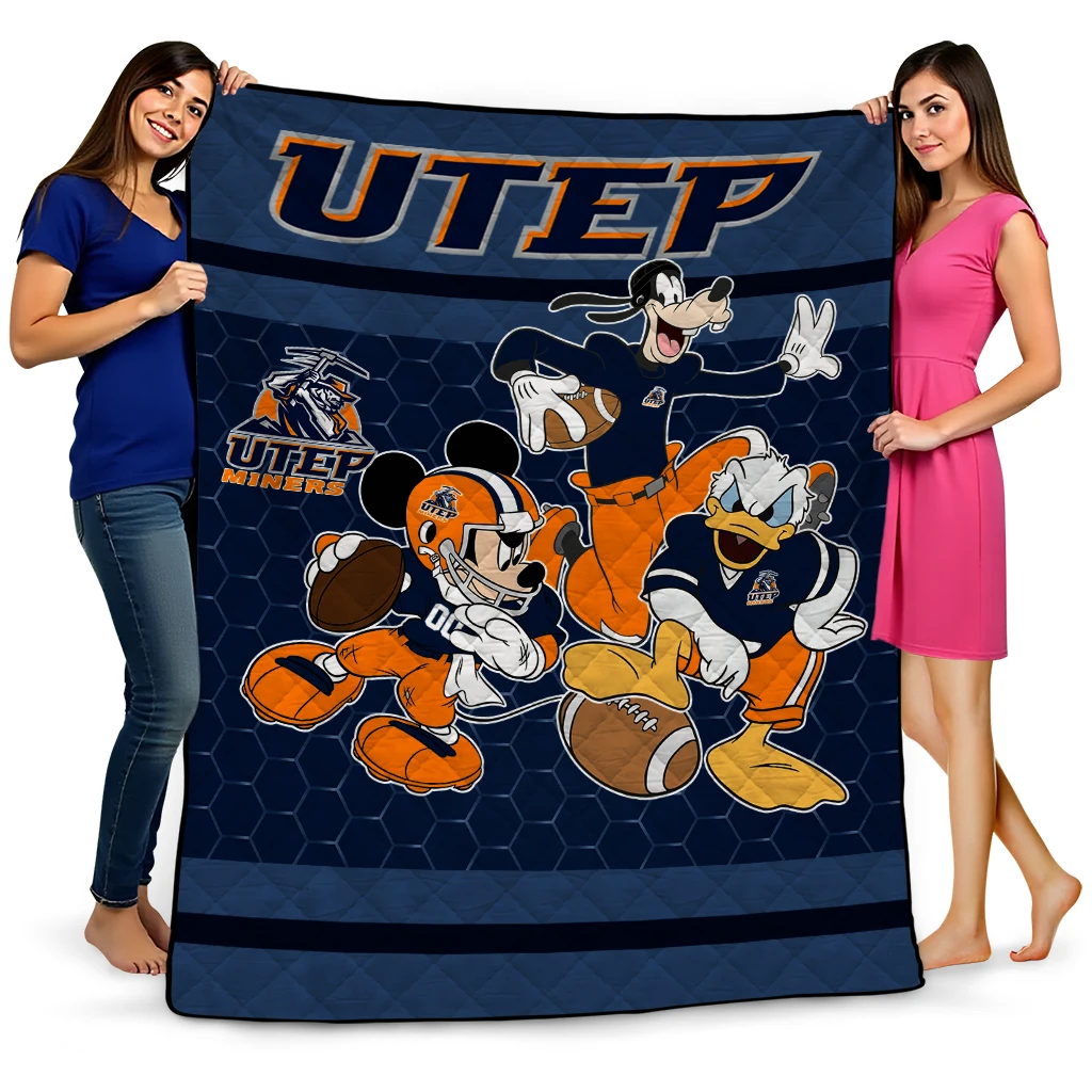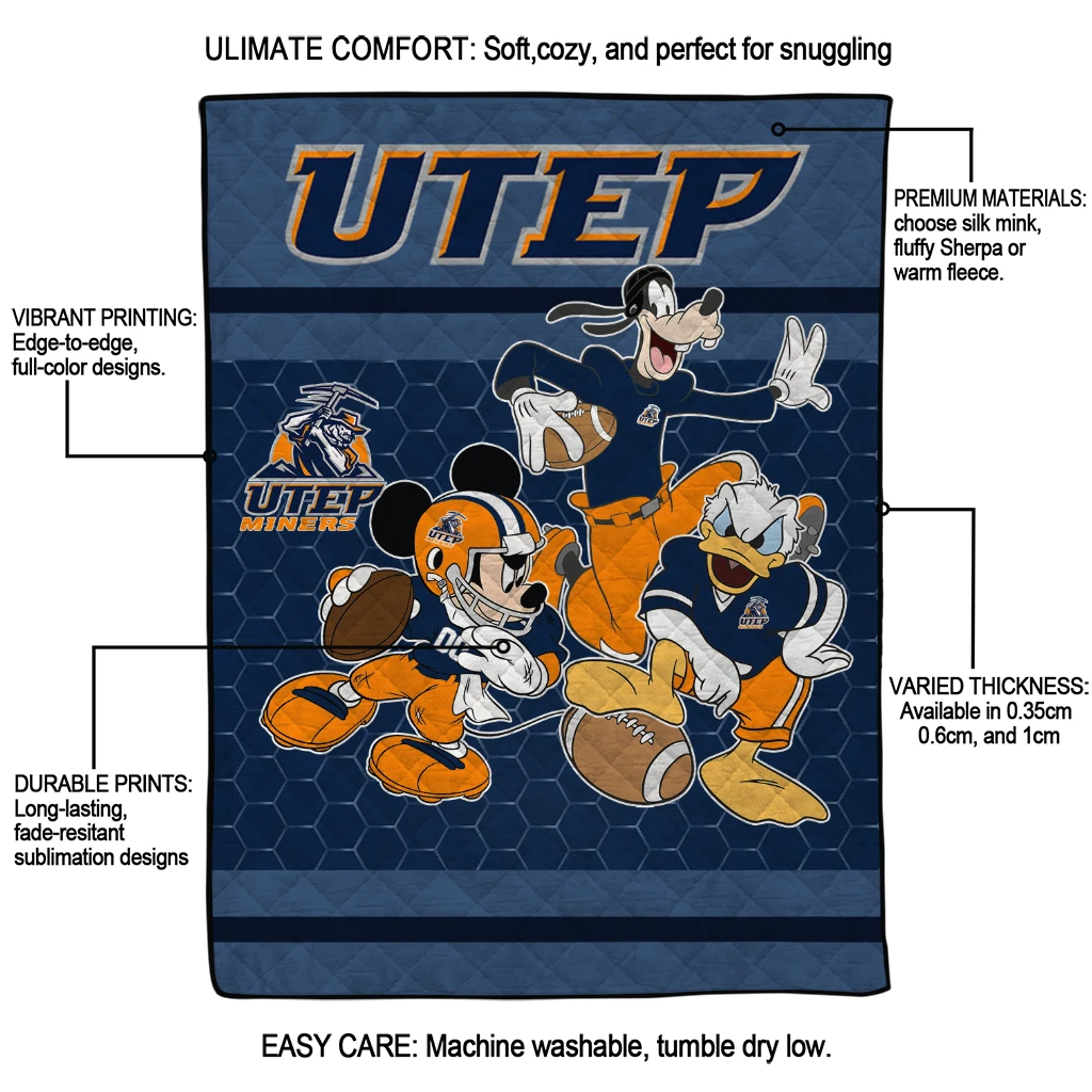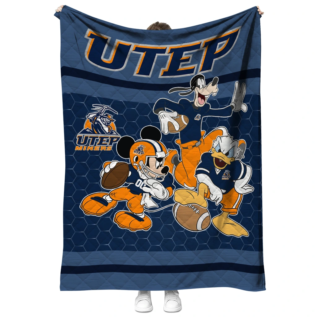 Wrap yourself in warmth and pride with the UTEP Miners Disney Football Blue Quilt Blanket from the UTEP Miners Blankets collection at Yes That Blanket. Made from 100% premium quilting-weight polyester blended with a touch of microfiber, this quilt offers a smooth, soft finish you’ll love. Choose between two quilting styles—Stipple or Diagonal—and enjoy the comfort of a cotton-filled layer inside that adds extra coziness for every season. The border is available in classic black or white, giving your design a clean, timeless edge.