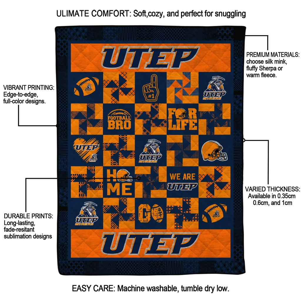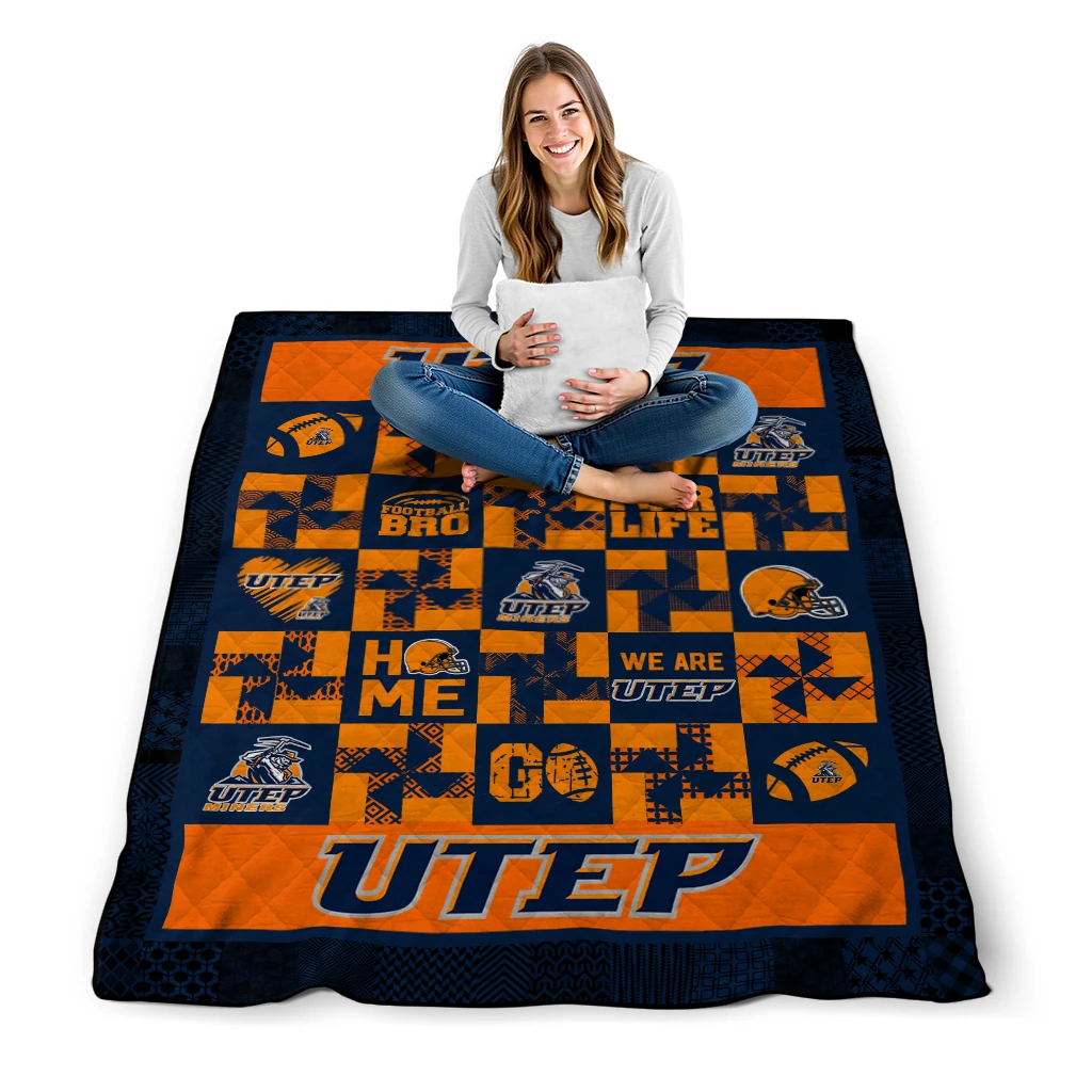 Wrap yourself in warmth and pride with the UTEP Miners Helmet Heart Blue Quilt Blanket from the UTEP Miners Blankets collection at Yes That Blanket. Made from 100% premium quilting-weight polyester blended with a touch of microfiber, this quilt offers a smooth, soft finish you’ll love. Choose between two quilting styles—Stipple or Diagonal—and enjoy the comfort of a cotton-filled layer inside that adds extra coziness for every season. The border is available in classic black or white, giving your design a clean, timeless edge.