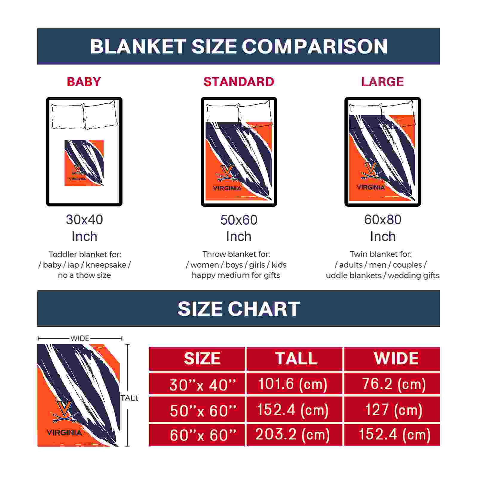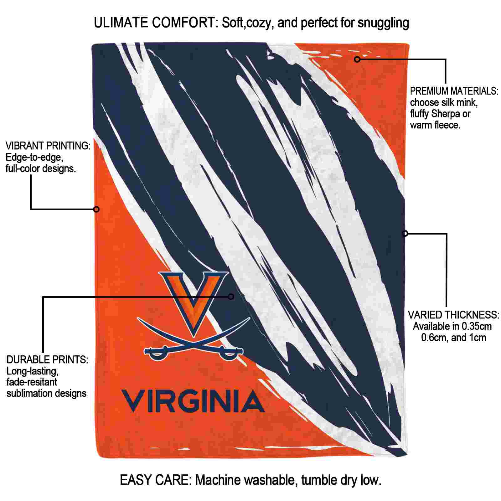 Without a doubt, the Virginia Cavaliers Brushstrokes Blue White Blanket from Virginia Cavaliers Blankets collection is offering true fans a chance to showcase passion in a cool way. Personalize it with your favorite team’s logo or a meaningful name to make it uniquely yours. Isn’t that great? The full-color print ensures vibrant, edge-to-edge designs, bringing your sports enthusiasm to life!