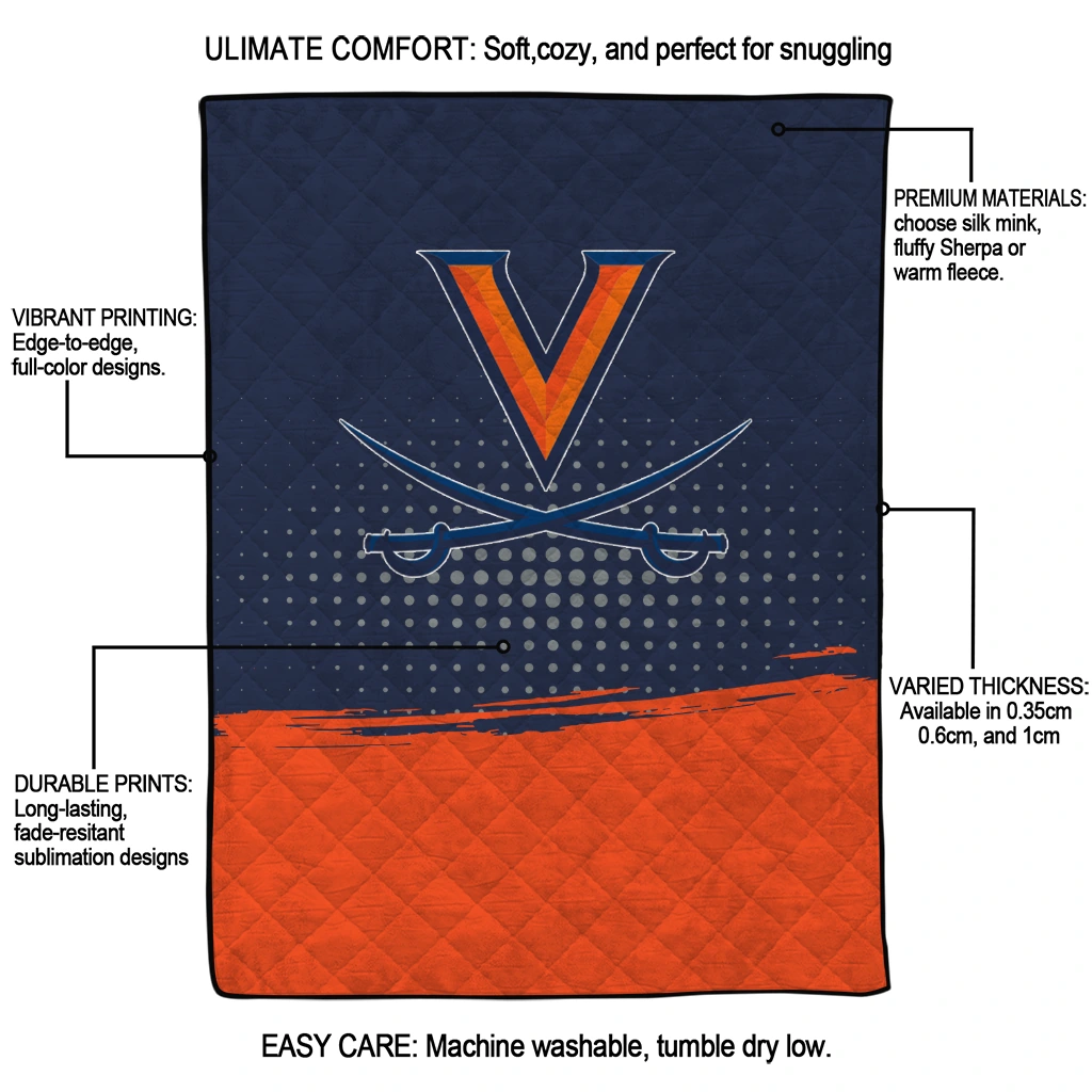 Wrap yourself in warmth and pride with the Virginia Cavaliers Dot Illusion Blue Quilt Blanket from the Virginia Cavaliers Blankets collection at Yes That Blanket. Made from 100% premium quilting-weight polyester blended with a touch of microfiber, this quilt offers a smooth, soft finish you’ll love. Choose between two quilting styles—Stipple or Diagonal—and enjoy the comfort of a cotton-filled layer inside that adds extra coziness for every season. The border is available in classic black or white, giving your design a clean, timeless edge.