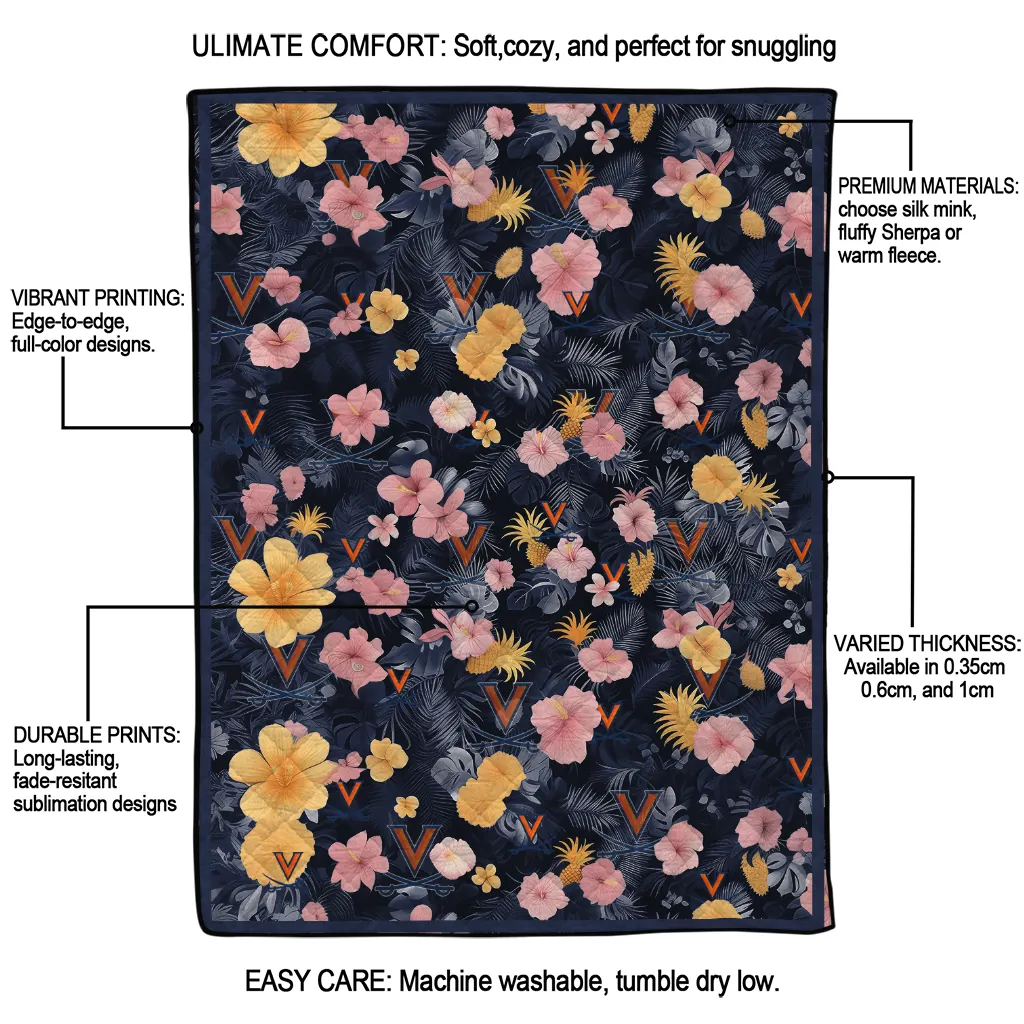 Wrap yourself in warmth and pride with the Virginia Cavaliers Hibiscus Foliage Blue Quilt Blanket from the Virginia Cavaliers Blankets collection at Yes That Blanket. Made from 100% premium quilting-weight polyester blended with a touch of microfiber, this quilt offers a smooth, soft finish you’ll love. Choose between two quilting styles—Stipple or Diagonal—and enjoy the comfort of a cotton-filled layer inside that adds extra coziness for every season. The border is available in classic black or white, giving your design a clean, timeless edge.