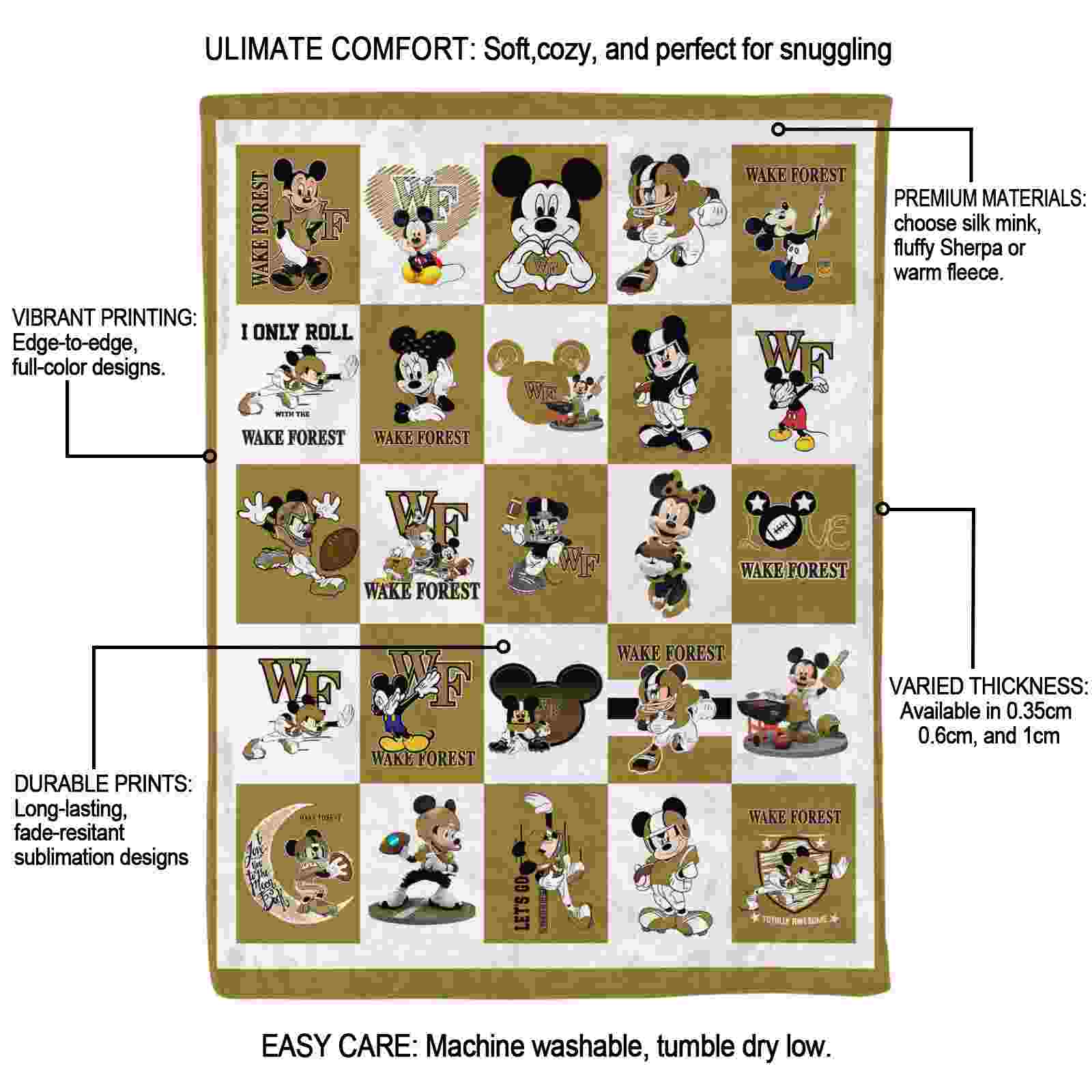 Without a doubt, the Wake Forest Demon Deacons Mickey Minnie Gold White Blanket from Wake Forest Demon Deacons Blankets collection is offering true fans a chance to showcase passion in a cool way. Personalize it with your favorite team’s logo or a meaningful name to make it uniquely yours. Isn’t that great? The full-color print ensures vibrant, edge-to-edge designs, bringing your sports enthusiasm to life!