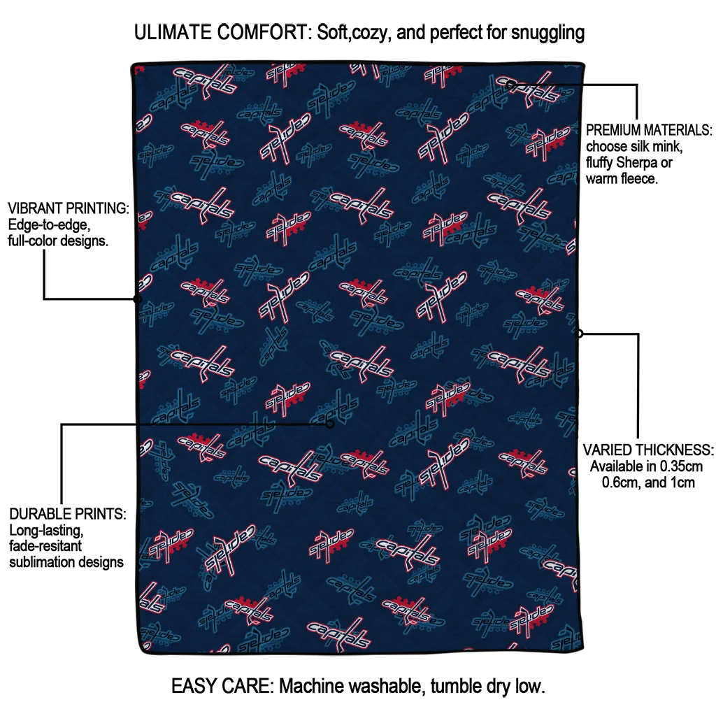 Wrap yourself in warmth and pride with the Washington Capitals Solid Classic Blue Quilt Blanket from the Washington Capitals Blankets collection at Yes That Blanket. Made from 100% premium quilting-weight polyester blended with a touch of microfiber, this quilt offers a smooth, soft finish you’ll love. Choose between two quilting styles—Stipple or Diagonal—and enjoy the comfort of a cotton-filled layer inside that adds extra coziness for every season. The border is available in classic black or white, giving your design a clean, timeless edge.