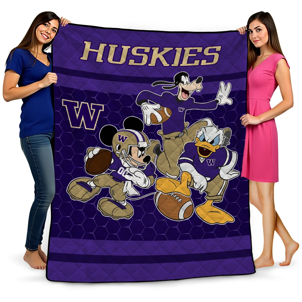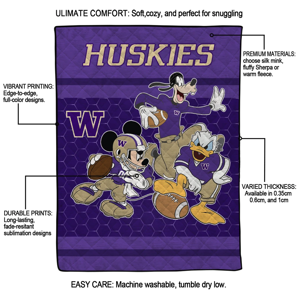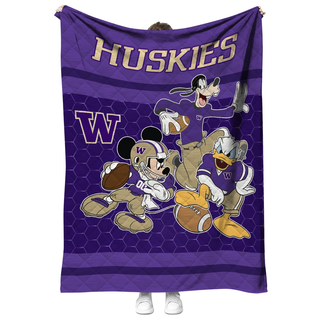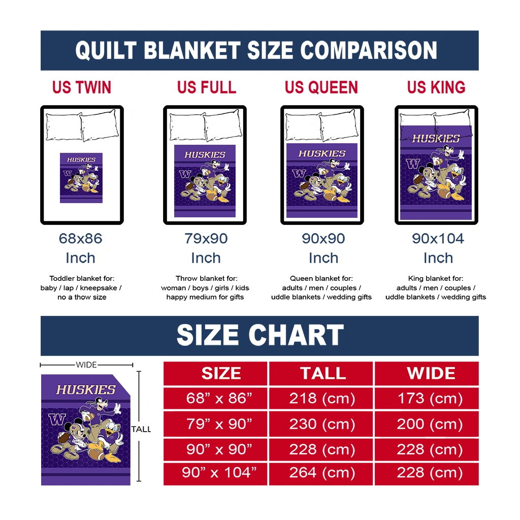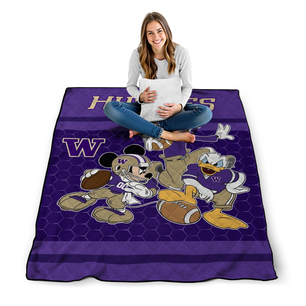 Wrap yourself in warmth and pride with the Washington Huskies Disney Football Purple Quilt Blanket from the Washington Huskies Blankets collection at Yes That Blanket. Made from 100% premium quilting-weight polyester blended with a touch of microfiber, this quilt offers a smooth, soft finish you’ll love. Choose between two quilting styles—Stipple or Diagonal—and enjoy the comfort of a cotton-filled layer inside that adds extra coziness for every season. The border is available in classic black or white, giving your design a clean, timeless edge.