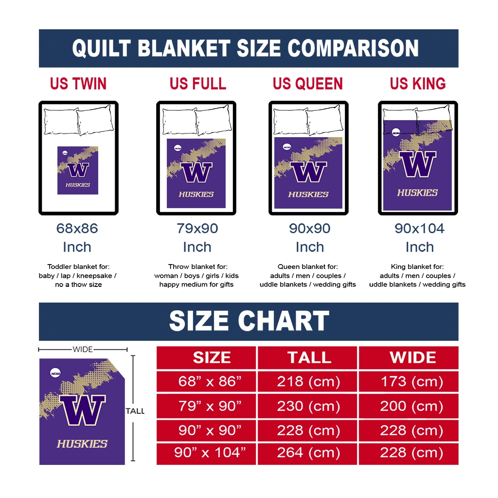 Wrap yourself in warmth and pride with the Washington Huskies Paint Trail Purple Quilt Blanket from the Washington Huskies Blankets collection at Yes That Blanket. Made from 100% premium quilting-weight polyester blended with a touch of microfiber, this quilt offers a smooth, soft finish you’ll love. Choose between two quilting styles—Stipple or Diagonal—and enjoy the comfort of a cotton-filled layer inside that adds extra coziness for every season. The border is available in classic black or white, giving your design a clean, timeless edge.