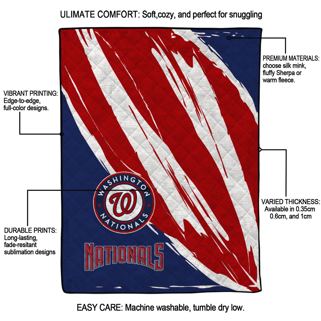 Wrap yourself in warmth and pride with the Washington Nationals Stroke Art Red White Quilt Blanket from the Washington Nationals Blankets collection at Yes That Blanket. Made from 100% premium quilting-weight polyester blended with a touch of microfiber, this quilt offers a smooth, soft finish you’ll love. Choose between two quilting styles—Stipple or Diagonal—and enjoy the comfort of a cotton-filled layer inside that adds extra coziness for every season. The border is available in classic black or white, giving your design a clean, timeless edge.