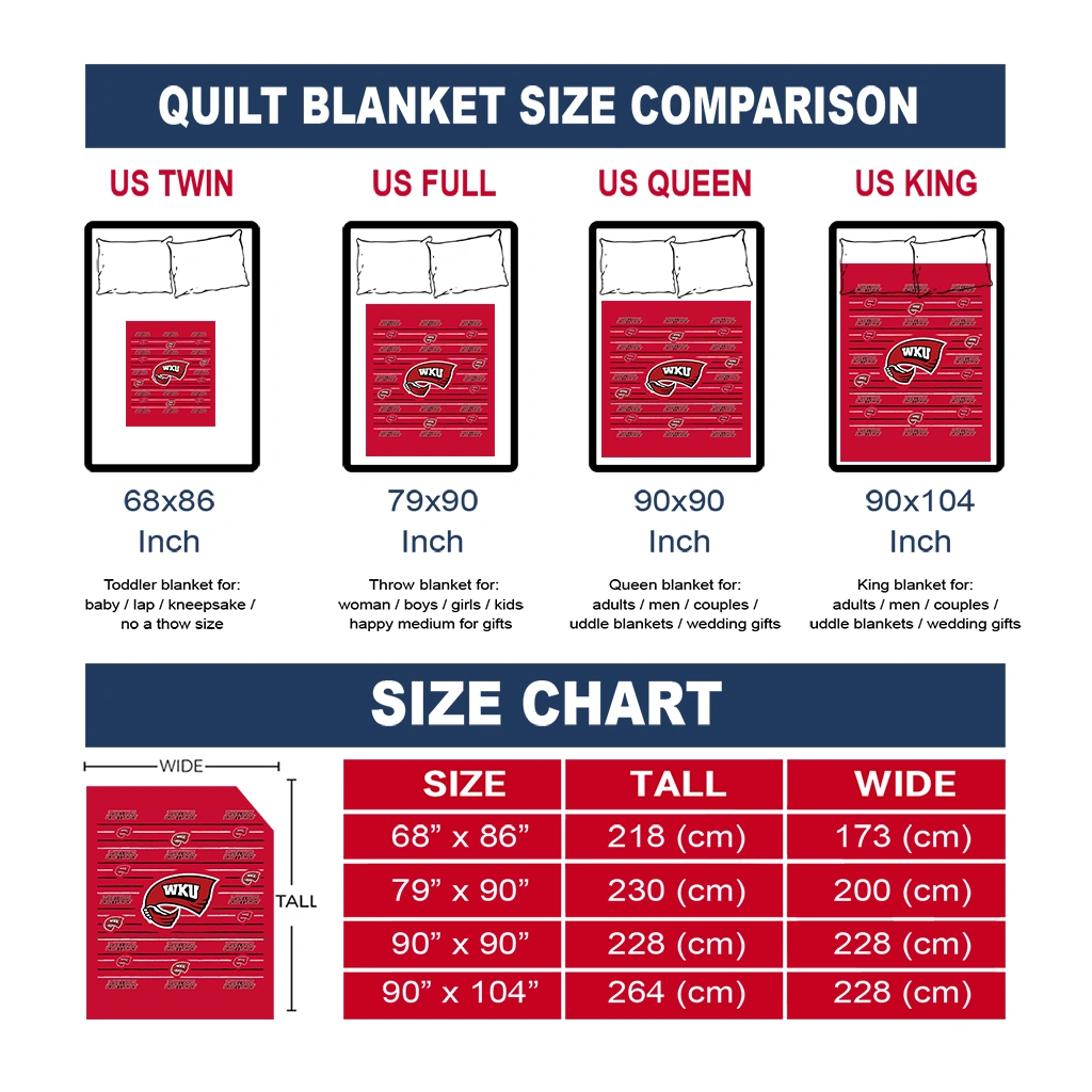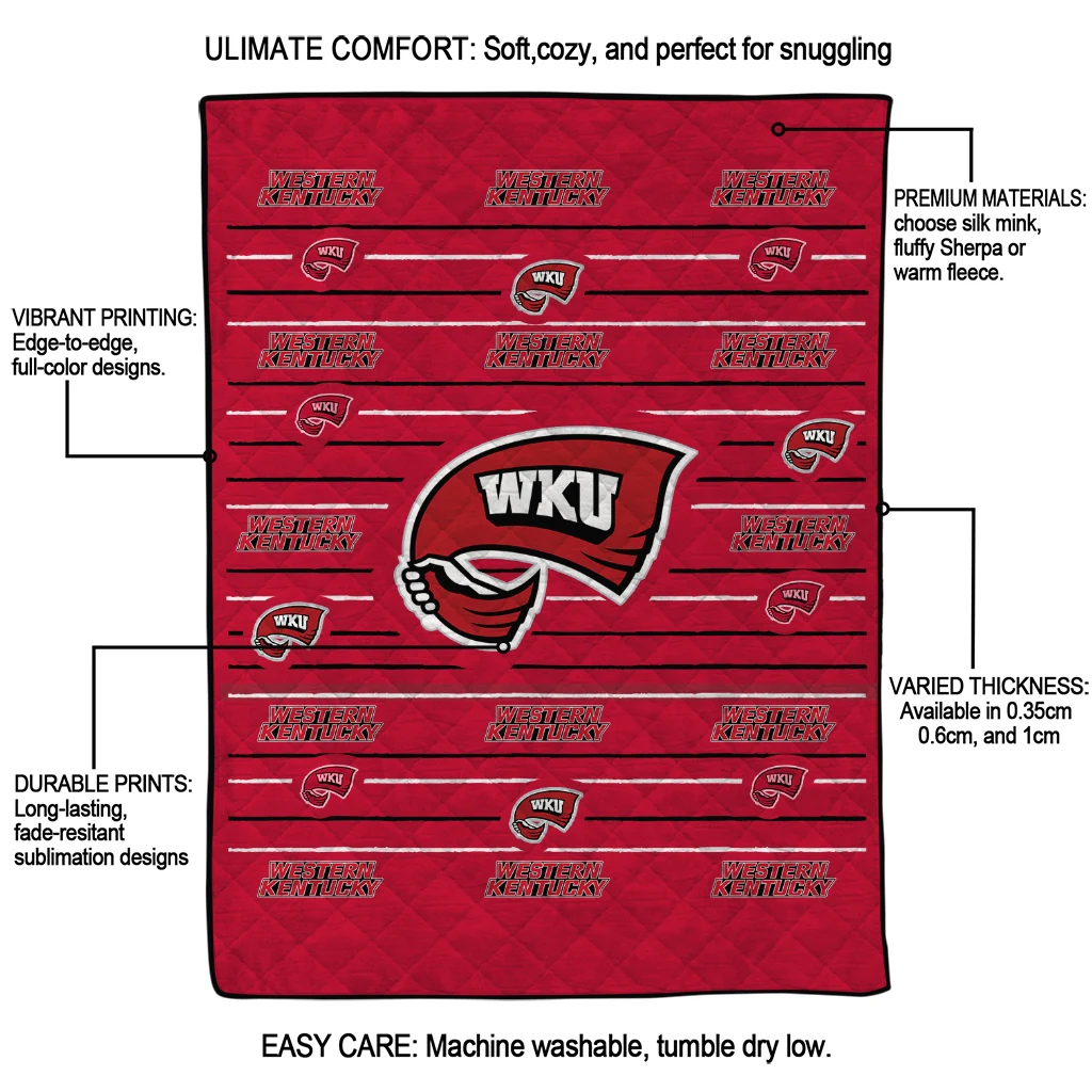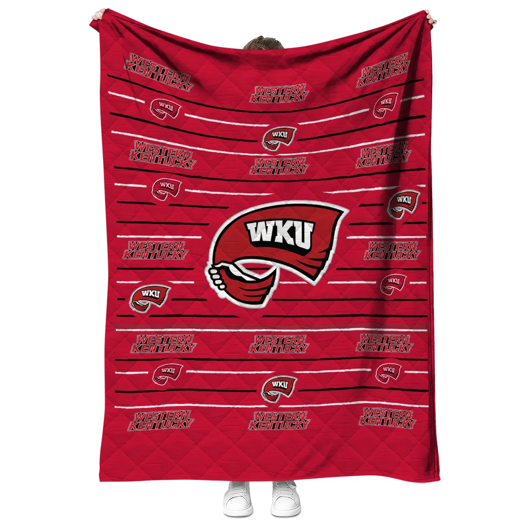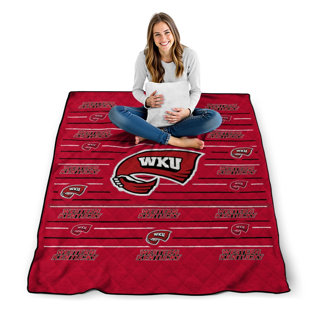 Wrap yourself in warmth and pride with the Western Kentucky Hilltoppers Handdrawn Stripes Red Quilt Blanket from the Western Kentucky Hilltoppers Blankets collection at Yes That Blanket. Made from 100% premium quilting-weight polyester blended with a touch of microfiber, this quilt offers a smooth, soft finish you’ll love. Choose between two quilting styles—Stipple or Diagonal—and enjoy the comfort of a cotton-filled layer inside that adds extra coziness for every season. The border is available in classic black or white, giving your design a clean, timeless edge.