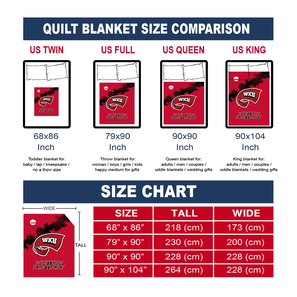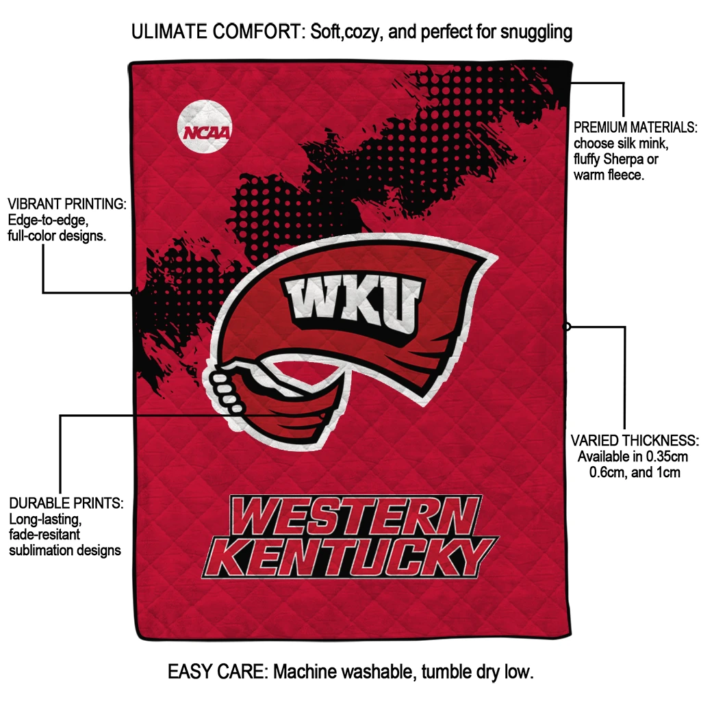 Wrap yourself in warmth and pride with the Western Kentucky Hilltoppers Paint Trail Red Quilt Blanket from the Western Kentucky Hilltoppers Blankets collection at Yes That Blanket. Made from 100% premium quilting-weight polyester blended with a touch of microfiber, this quilt offers a smooth, soft finish you’ll love. Choose between two quilting styles—Stipple or Diagonal—and enjoy the comfort of a cotton-filled layer inside that adds extra coziness for every season. The border is available in classic black or white, giving your design a clean, timeless edge.