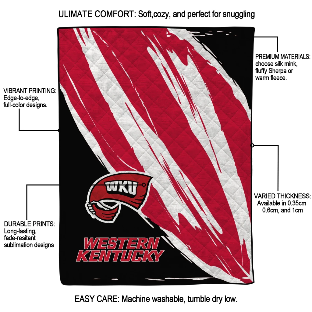 Wrap yourself in warmth and pride with the Western Kentucky Hilltoppers Stroke Art Red White Quilt Blanket from the Western Kentucky Hilltoppers Blankets collection at Yes That Blanket. Made from 100% premium quilting-weight polyester blended with a touch of microfiber, this quilt offers a smooth, soft finish you’ll love. Choose between two quilting styles—Stipple or Diagonal—and enjoy the comfort of a cotton-filled layer inside that adds extra coziness for every season. The border is available in classic black or white, giving your design a clean, timeless edge.