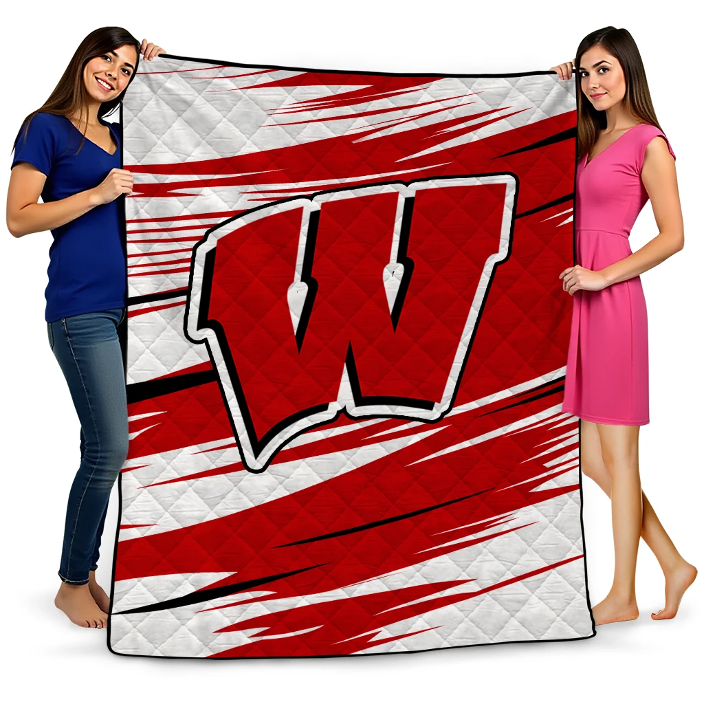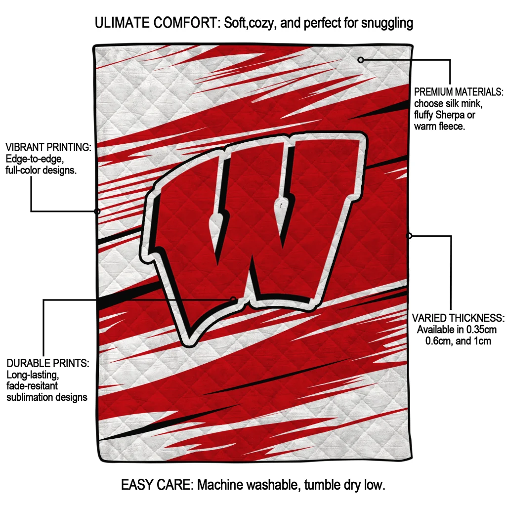 Wrap yourself in warmth and pride with the Wisconsin Badgers Wild Lines Red White Quilt Blanket from the Wisconsin Badgers Blankets collection at Yes That Blanket. Made from 100% premium quilting-weight polyester blended with a touch of microfiber, this quilt offers a smooth, soft finish you’ll love. Choose between two quilting styles—Stipple or Diagonal—and enjoy the comfort of a cotton-filled layer inside that adds extra coziness for every season. The border is available in classic black or white, giving your design a clean, timeless edge.
