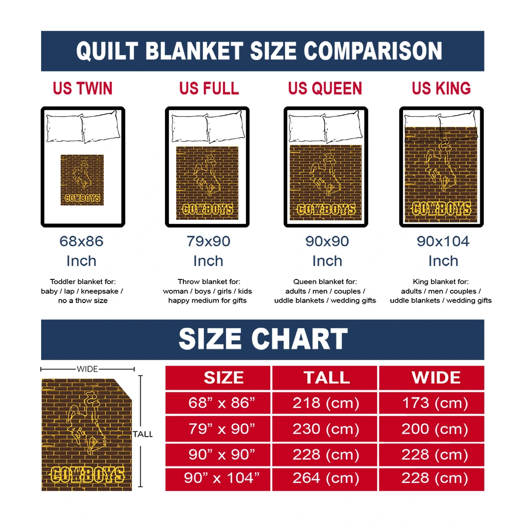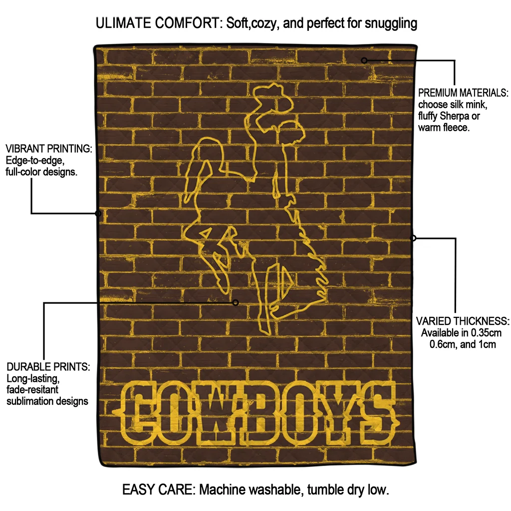 The Wyoming Cowboys Brick Grid Brown Quilt Blanket is more than a blanket—it’s everyday comfort, thoughtfully made. Crafted from premium quilting fabric with a soft microfiber touch, it offers a smooth hand-feel and lasting coziness. Layered quilting with a cotton-filled core provides adaptable warmth across seasons while maintaining a clean, tailored look on your bed or sofa.